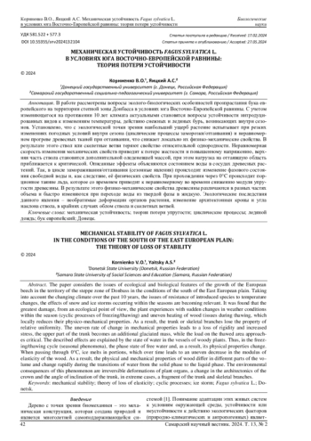В работе рассмотрены вопросы эколого-биологических особенностей произрастания бука европейского на территории степной зоны Донбасса в условиях юга Восточно-Европейской равнины. С учетом изменяющегося на протяжении 10 лет климата актуальными становятся вопросы устойчивости интродуцированных видов к изменениям температуры, действию снежных и ледяных бурь, возникающих внутри сезонов. Установлено, что с экологической точки зрения наибольший ущерб растение испытывает при резких изменениях погодных условий внутри сезона (циклические процессы заморозки/оттаивания) и неравномерном прогреве древесных тканей при оттаивании, что снижает локально их физико-механические свойства. В результате этого ствол или скелетные ветви теряют свойство относительной однородности. Неравномерная скорость изменения механических свойств приводит к потере жесткости и повышенному напряжению, верхняя часть ствола становится дополнительной оледеневшей массой, при этом нагрузка на оттаявшую область приближается к критической. Описанные эффекты объясняются состоянием воды в сосудах древесных растений. Так, в цикле замораживания/оттаивания (сезонные явления) происходит изменение фазового состояния свободной воды и, как следствие, её физических свойств. При прохождении через 0°C происходит порционное таяние льда, которое со временем приводит к неравномерному во времени снижению модуля упругости древесины. В результате этого физико-механические свойства древесины различаются в разных частях объема и быстро изменяются при переходе воды из твердой фазы в жидкую. Экологические последствия данного явления - необратимые деформации органов растения, изменение архитектоники кроны и угла наклона ствола, в крайних случаях облом ствола и скелетных ветвей.