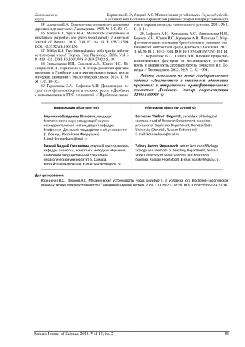 13. Корниенко В.О., Калаев В.Н. Жизнеспособность дуба черешчатого в условиях города Донецка // Сибирский лесной журнал. 2024. № 4. С. 95-106. DOI: 10.15372/sjfs20240409 EDN: SPLUNB