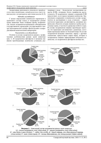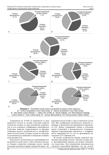 Экскременты различных групп животных обеспечивают биологический круговорот веществ в экосистемах. В результате разложения непереваренных остатков органической массы как растительного, так и животного происхождения происходит высвобождение (выщелачивание) минеральных элементов питания для растений, способствующих созданию новой органической массы, которая, в свою очередь, вновь вовлекается в биологический круговорот. В статье рассмотрены некоторые свойства и показатели экскрементов животных, условно разделённых по трофическим особенностям на фитофагов (лось, заяц-беляк), всеядных (медведь, кабан) и хищников (лисица, волк). Химический состав экскрементов разных групп животных имеет характерное отличие и зависит от питания. А в результате аккумулятивной функции гумусовых веществ при разложении экскрементов в почвах накапливаются в форме органических соединений углерод, азот, фосфор и другие, необходимые для жизнедеятельности растений и микроорганизмов элементы. Фитофаги и отчасти всеядные наземные млекопитающие играют важную роль в трансформации и минерализации растительного органического вещества и фактически выступают в экосистемах в качестве опосредственных редуцентов (в данном случае оценка проведена на входе и выходе из организма животного и расщепление органики рассматривается как функция данного организма). Хищные животные принимают участие в круговороте веществ в меньшей степени, чем фитофаги и всеядные, трансформируя и минерализуя белковые вещества. Экскременты животных представляют собой непереваренные измельченные остатки, и их дальнейшая переработка осуществляется независимо от животных, то есть вне их организмов.