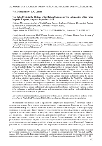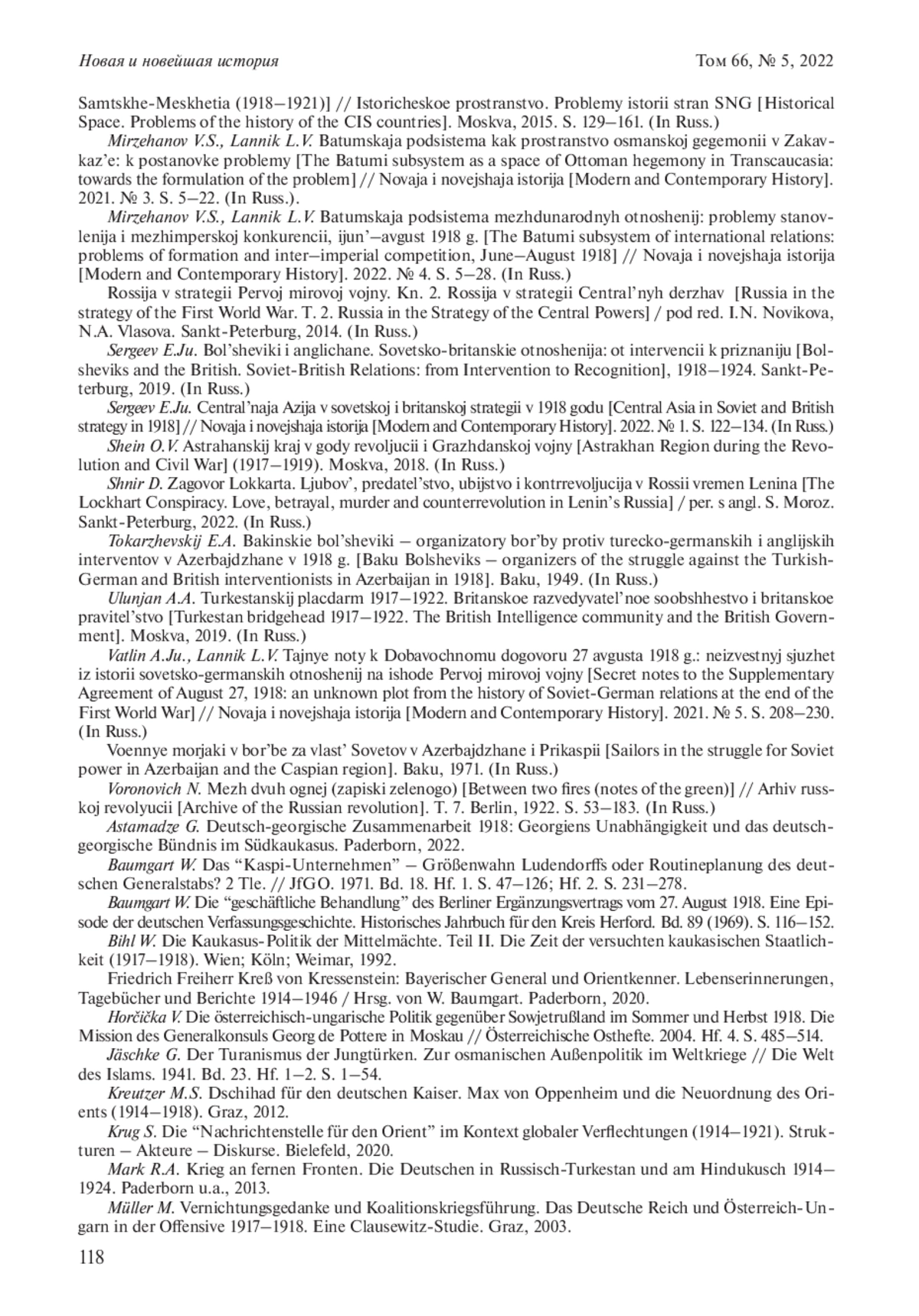 15. Мирзеханов В.С., Ланник Л.В. Батумская подсистема международных отношений: проблемы становления и межимперской конкуренции, июнь-август 1918 г. // Новая и новейшая история. 2022. № 4. С. 5-28. EDN: STVCFE