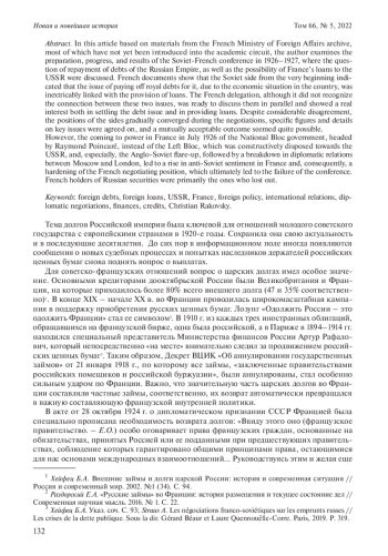 Статья: К ВОПРОСУ О ДОЛГАХ ЦАРСКОЙ РОССИИ. СОВЕТСКО-ФРАНЦУЗСКАЯ КОНФЕРЕНЦИЯ 1926-1927 ГОДОВ ПО МАТЕРИАЛАМ АРХИВА МИД ФРАНЦИИ (2022)