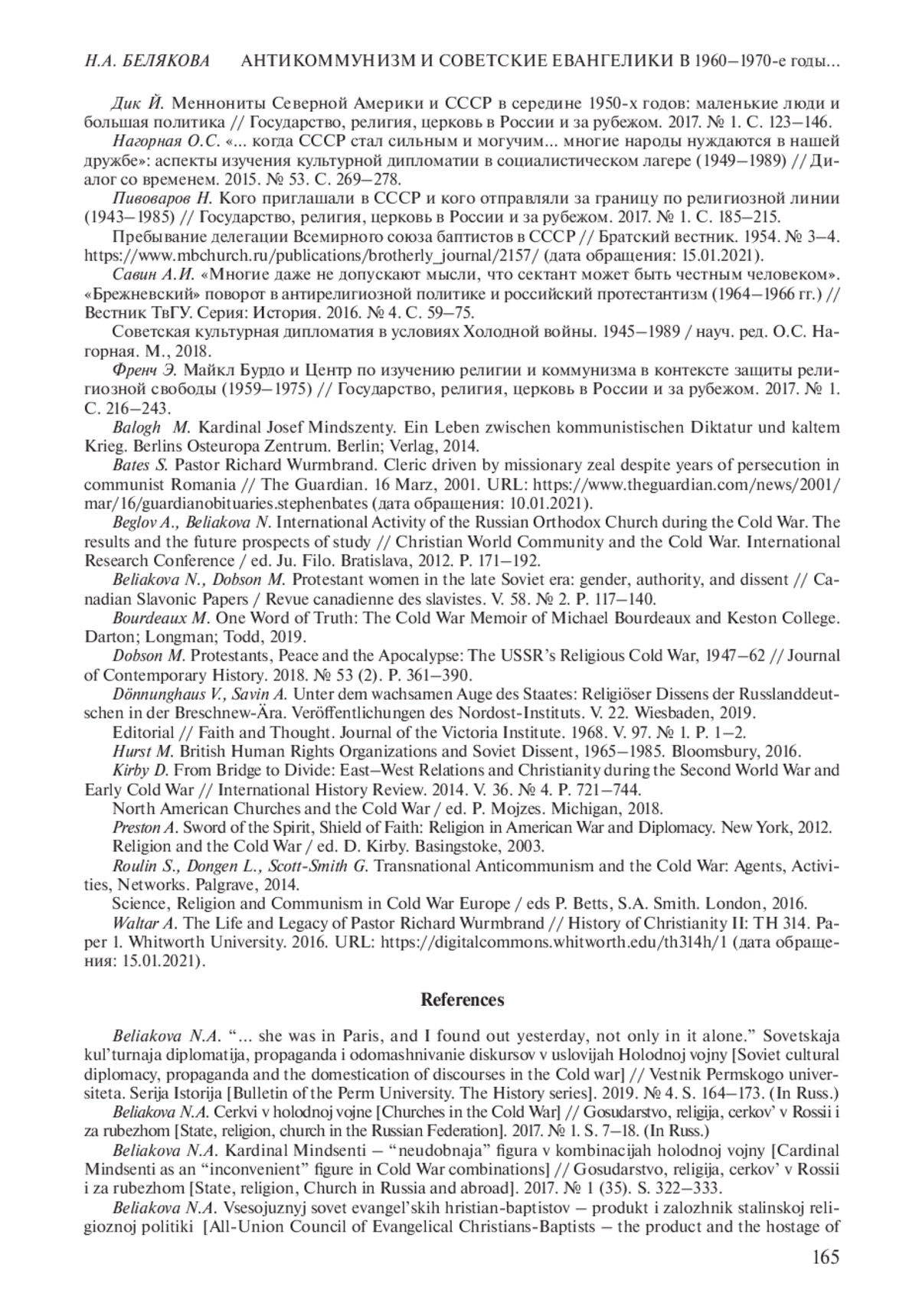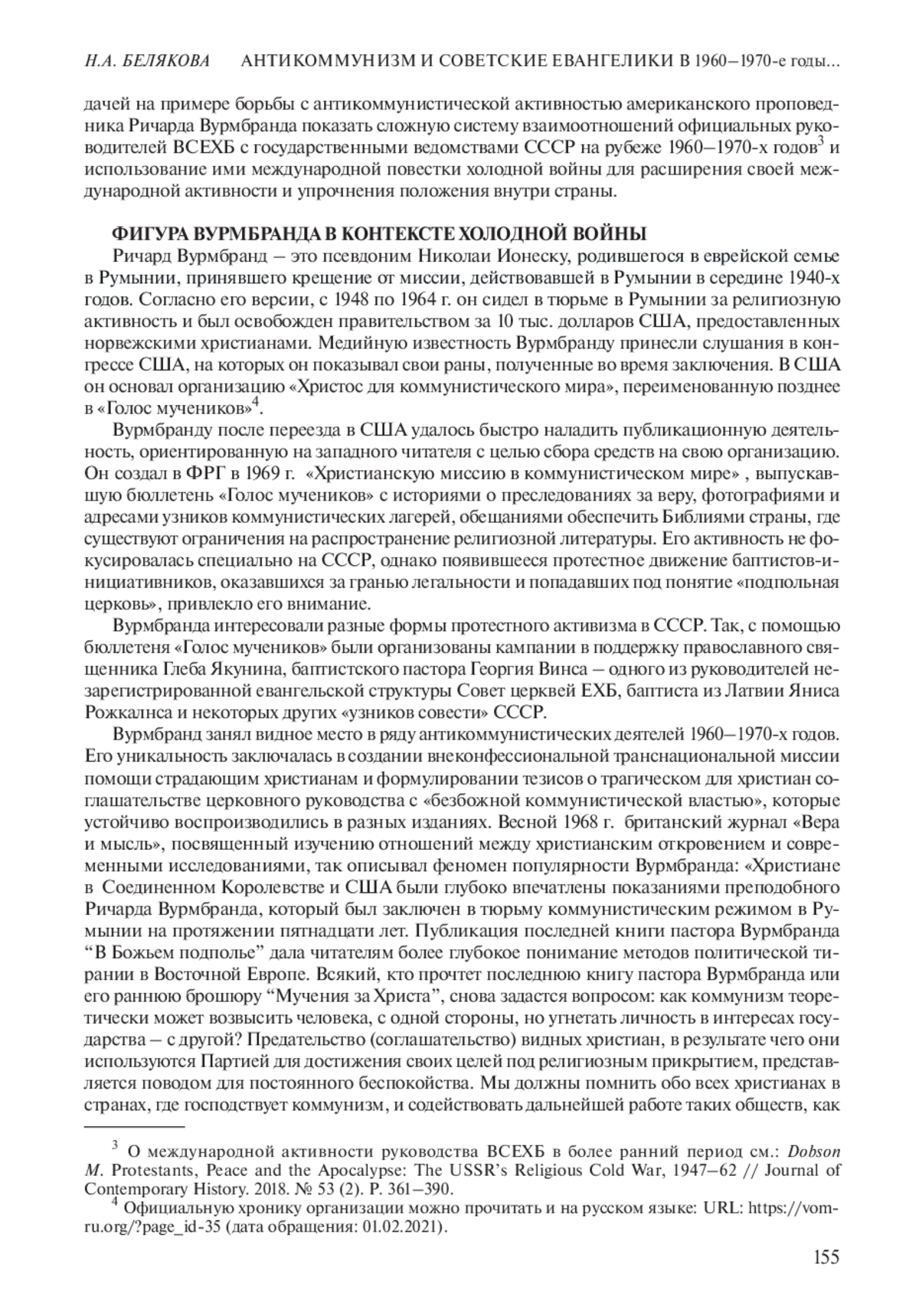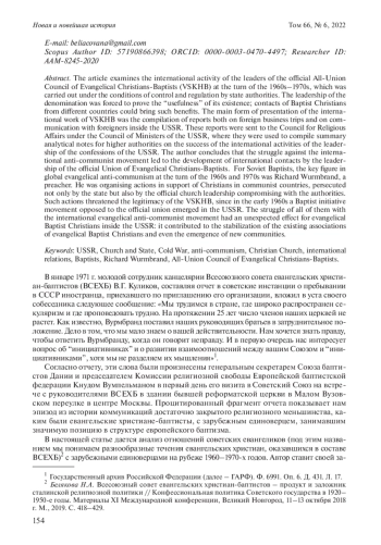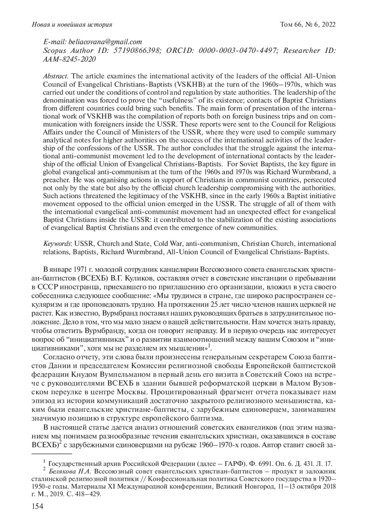 БЕЛЯКОВА Н. А. АНТИКОММУНИЗМ И СОВЕТСКИЕ ЕВАНГЕЛИКИ В 1960-1970-Е ГОДЫ: МЕТАМОРФОЗЫ ОТНОШЕНИЙ В УСЛОВИЯХ ХОЛОДНОЙ ВОЙНЫ // НОВАЯ И НОВЕЙШАЯ ИСТОРИЯ. 2022. № 6