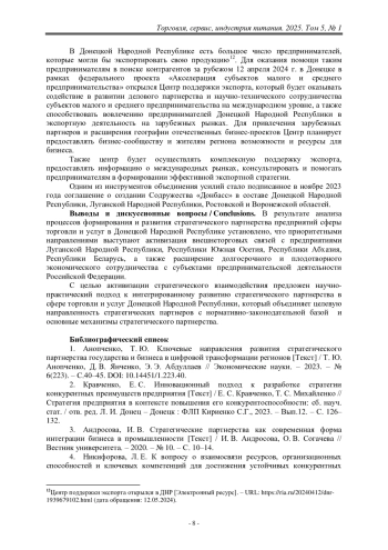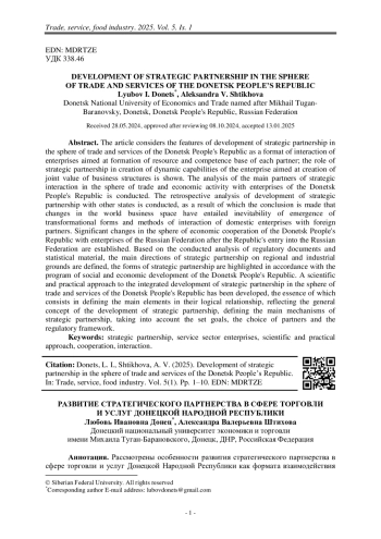 Рассмотрены особенности развития стратегического партнерства в сфере торговли и услуг Донецкой Народной Республики как формата взаимодействия предприятий, направленного на формирование ресурсно-компетентционной базы каждого партнера; показана роль стратегического партнерства в создании динамических способностей предприятия, ориентированных на создание совместной ценности предпринимательских структур. Проведен анализ основных партнеров стратегического взаимодействия в сфере торгово-экономической деятельности с предприятиями Донецкой Народной Республики. Проведен ретроспективный анализ развития стратегического партнерства с другими государствами, в результате которого сделан вывод о том, что изменения мирового бизнес-пространства повлекли неизбежность появления трансформационных форм и способов взаимодействия отечественных предприятий с зарубежными партнерами. Установлены значительные изменения в области экономического сотрудничества Донецкой Народной Республики с предприятиями Российской Федерации после вхождения Республики в состав Российской Федерации. На основе проведенного анализа нормативно-правовых документов и статистического материала определены основные направления стратегического партнерства по регионально-отраслевому признаку, выделены формы стратегического партнерства в соответствии с программой социально-экономического развития Донецкой Народной Республики. Разработан научно-практический подход к интегрированному развитию стратегического партнерства в сфере торговли и услуг Донецкой Народной Республики, сущность которого состоит в определении основных элементов (в их логической взаимосвязи), отражающих общую концепцию развития стратегического партнерства и определяющих основные механизмы стратегического партнерства с учетом поставленных целей, выбора партнеров и нормативно-правовой базы.