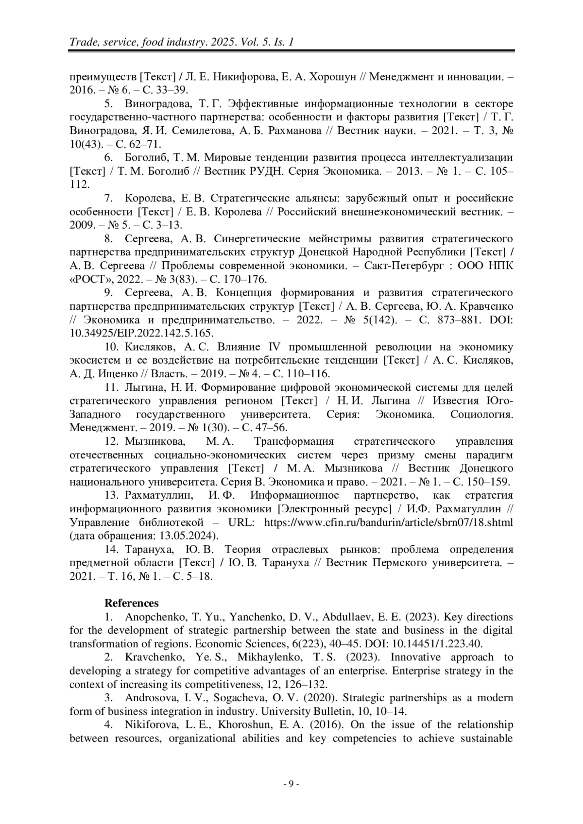 1. Анопченко, Т. Ю. Ключевые направления развития стратегического партнерства государства и бизнеса в цифровой трансформации регионов [Текст] / Т. Ю. Анопченко, Д. В. Янченко, Э. Э. Абдуллаев // Экономические науки. – 2023. – № 6(223). – С.40–45. DOI: 10.14451/1.223.40.
