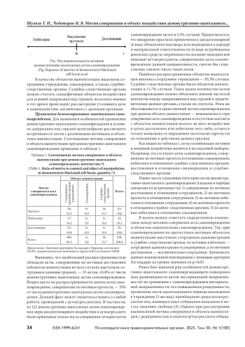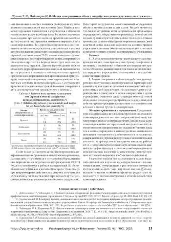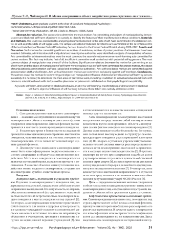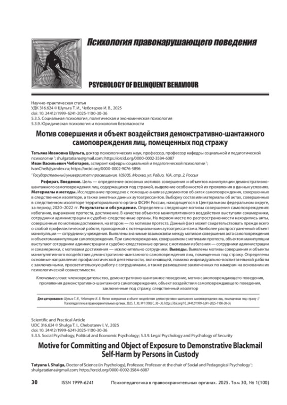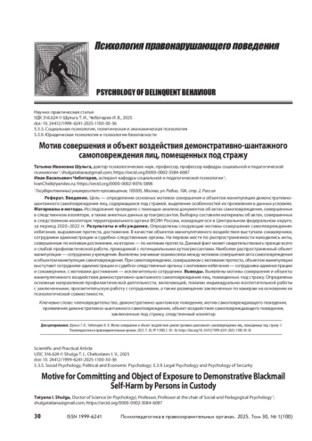 Цель — определение основных мотивов совершения и объектов манипуляции демонстративношантажного самоповреждения лиц, содержащихся под стражей, выделение особенностей их проявления в данных условиях. Материалы и методы. Исследование проведено с помощью анализа документов об актах самоповреждения, совершенных в следственном изоляторе, а также анкетных данных аутоагрессантов. Выборку составили материалы об актах, совершенных в следственном изоляторе территориального органа ФСИН России, находящегося в Центральном федеральном округе, за период 2020–2022 гг. Результаты и обсуждение. Определены следующие мотивы совершения самоповреждения: избегание, выражение протеста, достижение. В качестве объектов манипулятивного воздействия выступали сокамерники, сотрудники администрации и судебно-следственные органы. На первом месте по распространенности находились акты, совершенные по мотивам достижения, на втором — по мотивам протеста. Данный факт может свидетельствовать прежде всего о слабой профилактической работе, проводимой с потенциальными аутоагрессантами. Наиболее распространенный объект манипуляции — сотрудники учреждения. Выявлены значимые взаимосвязи между мотивом совершения акта самоповреждения и объектом манипуляции самоповреждения. При самоповреждении, совершаемом с мотивами протеста, объектом манипуляции выступают сотрудники администрации и судебно-следственные органы; с мотивами избегания — сотрудники администрации и сокамерники, с мотивами достижения — исключительно сотрудники. Выводы. Выявлены мотивы совершения и объекты манипулятивного воздействия демонстративно-шантажного самоповреждения лиц, помещенных под стражу. Определены основные направления профилактической деятельности, включающей, помимо индивидуально-воспитательной работы с заключенными, просветительскую работу с сотрудниками, а также размещение заключенных по камерам на основании их психологической совместимости.
