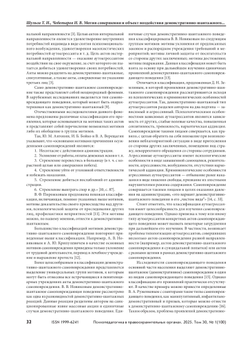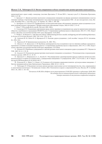 14. Землин Д. Н. Психология демонстративно-шантажного поведения осужденных // Психопедагогика в правоохранительных органах. 2009. № 3. С. 32–35.