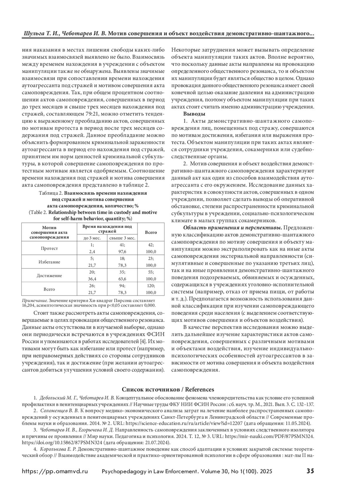 3. Чеботарев И. В., Егорычева И. Д. Направленность самоповреждения заключенных в условиях следственного изолятора и причины ее проявления // Мир науки. Педагогика и психология. 2024. Т. 12, № 3. URL: https://mir-nauki.com/PDF/87PSMN324. https://doi.org/10.15862/87PSMN324 (дата обращения: 21.07.2024).