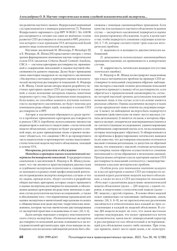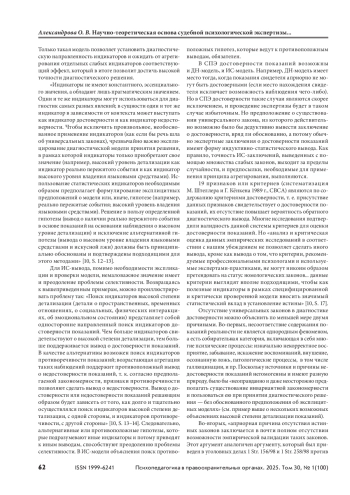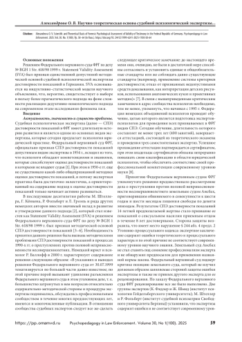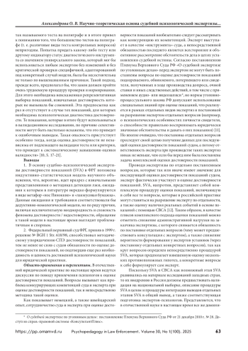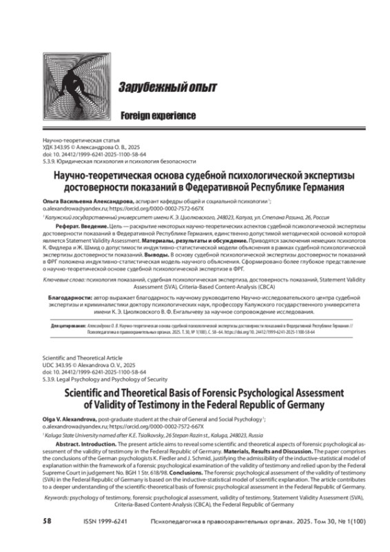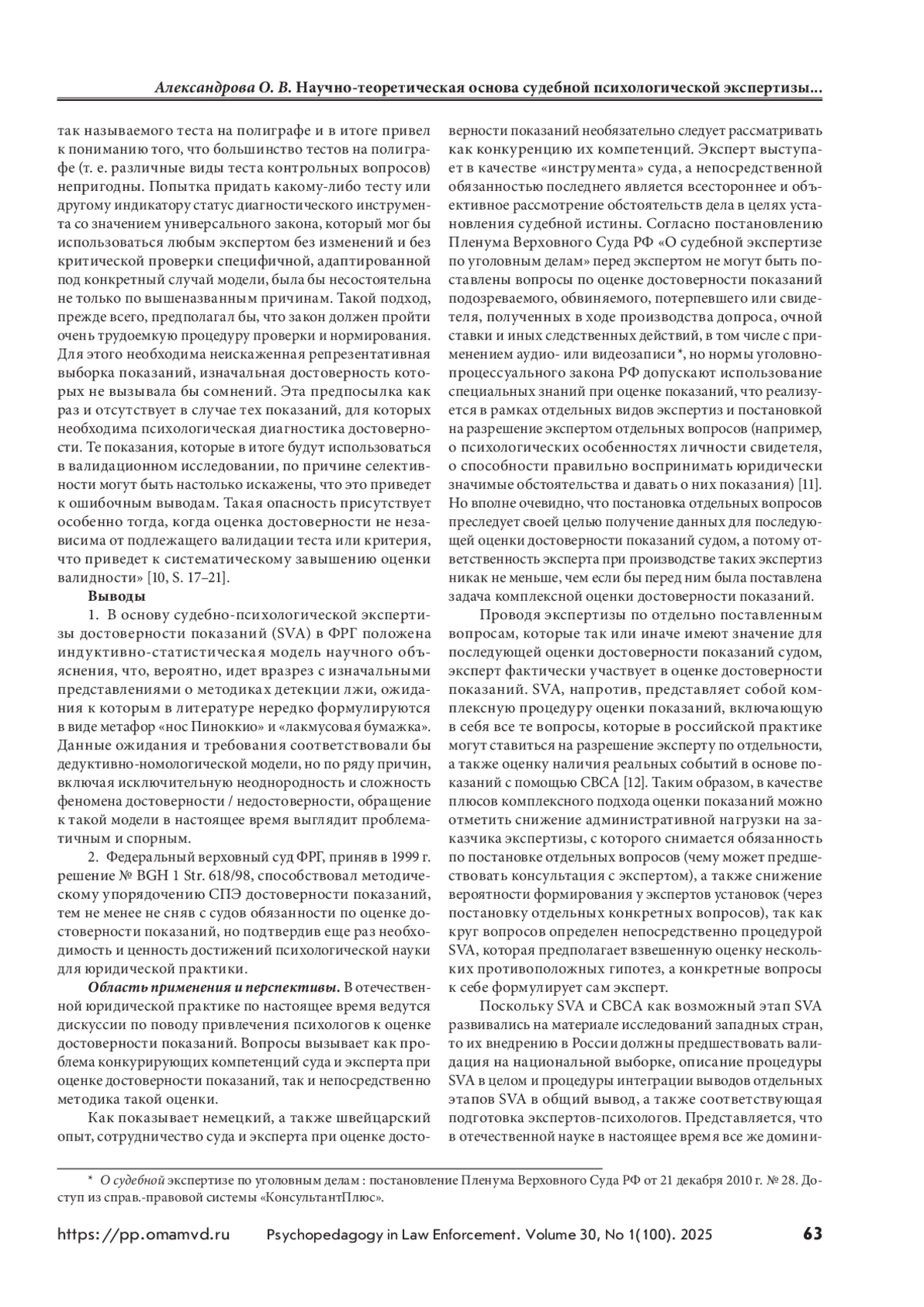 5. Александрова О. В. Судебная психологическая экспертиза достоверности показаний в Германии: методические основы // Молодежь — психологической науке: исследовательские практики и проекты : сб. мат-лов всерос. науч.-практ. конф. молодых ученых (студентов, магистров, аспирантов), Калуга, 08–09 декабря 2022 г. / под ред. И. П. Краснощеченко. Калуга, 2023. С. 40–46.