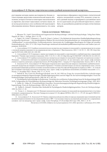 6. Енгалычев В. Ф., Александрова О. В. Некоторые теоретические и практические вопросы становления судебной психологической экспертизы достоверности показаний в Германии // Уголовно-исполнительная система на современном этапе с учетом реализации Концепции развития уголовно-исполнительной системы Российской Федерации на период до 2030 г. : сб. тезисов выступлений и докладов участников междунар. науч.-практ. конф. по проблемам исполнения уголовных наказаний : в 2 т., Рязань, 17–18 ноября 2022 г. Рязань, 2022. Т. 1. С. 91–97.