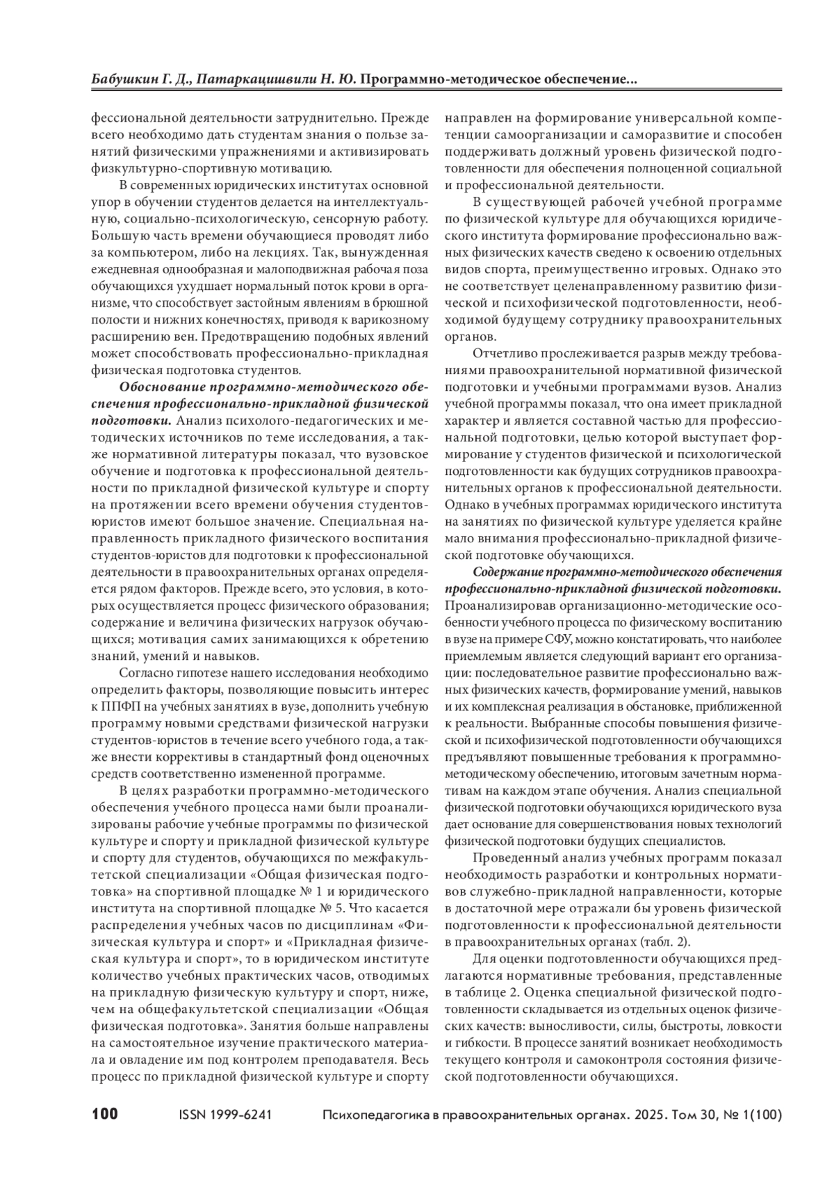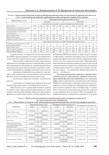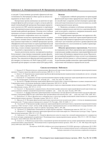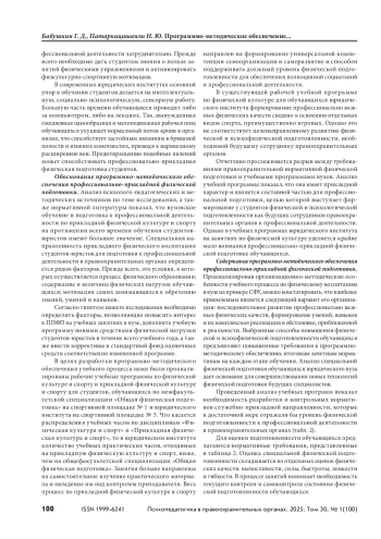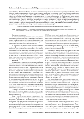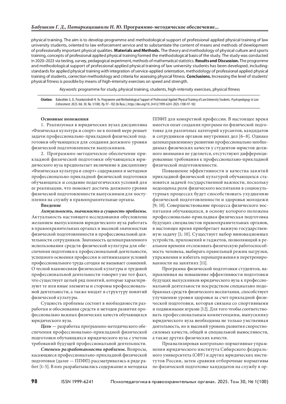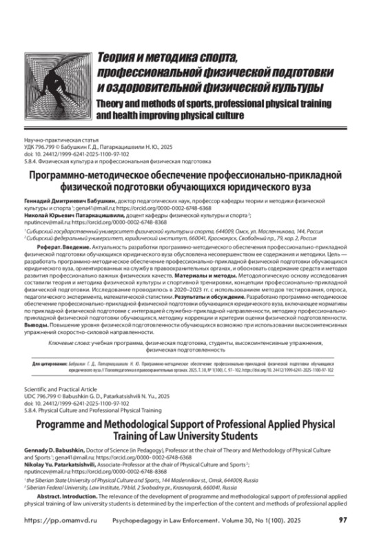 Актуальность разработки программно-методического обеспечения профессионально-прикладной физической подготовки обучающихся юридического вуза обусловлена несовершенством ее содержания и методики. Цель — разработать программно-методическое обеспечение профессионально-прикладной физической подготовки обучающихся юридического вуза, ориентированных на службу в правоохранительных органах, и обосновать содержание средств и методов развития профессионально важных физических качеств. Материалы и методы. Методологическую основу исследования составили теория и методика физической культуры и спортивной тренировки, концепции профессионально-прикладной физической подготовки. Исследование проводилось в 2020–2023 гг. с использованием методов тестирования, опроса, педагогического эксперимента, математической статистики. Результаты и обсуждение. Разработано программно-методическое обеспечение профессионально-прикладной физической подготовки обучающихся юридического вуза, включающее нормативы по прикладной физической подготовке с интеграцией служебно-прикладной направленности, методику профессиональноприкладной физической подготовки обучающихся, методику коррекции и критерии оценки физической подготовленности. Выводы. Повышение уровня физической подготовленности обучающихся возможно при использовании высокоинтенсивных упражнений скоростно-силовой направленности.