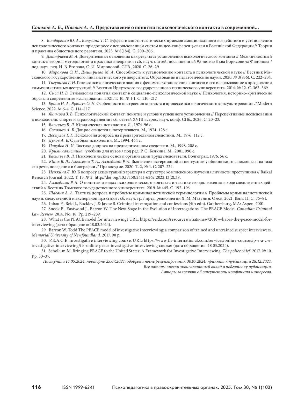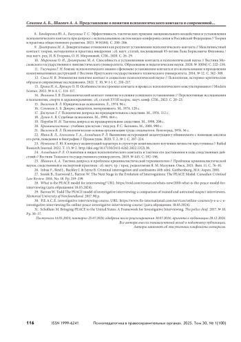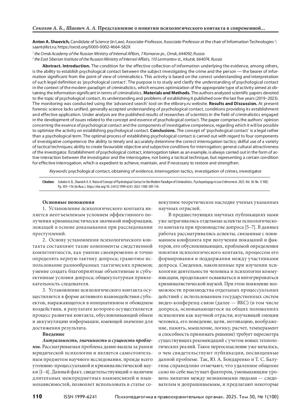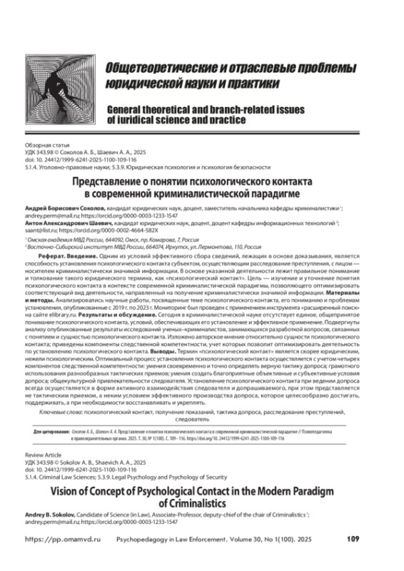 СОКОЛОВ А. Б., ШАЕВИЧ А. А. ПРЕДСТАВЛЕНИЕ О ПОНЯТИИ ПСИХОЛОГИЧЕСКОГО КОНТАКТА В СОВРЕМЕННОЙ КРИМИНАЛИСТИЧЕСКОЙ ПАРАДИГМЕ // ПСИХОПЕДАГОГИКА В ПРАВООХРАНИТЕЛЬНЫХ ОРГАНАХ. 2025. № 1 (100), ТОМ 30