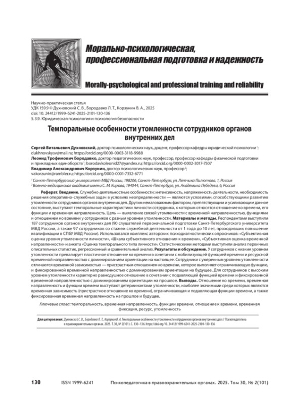 Служебно-деятельностные особенности: интенсивность, напряженность деятельности, необходимость решения оперативно-служебных задач в условиях неопределенности — являются условиями, способствующими развитию утомленности сотрудников органов внутренних дел. Другим немаловажным фактором, препятствующим и усиливающим данное состояние, выступают темпоральные характеристики личности сотрудника, к которым относятся отношение ко времени, его функции и временная направленность. Цель — выявление связей утомленности с временной направленностью, функциями и отношением ко времени у сотрудников с разным уровнем утомленности. Материалы и методы. Респондентами выступили 187 сотрудников органов внутренних дел (90 слушателей первоначальной подготовки Санкт-Петербургского университета МВД России, а также 97 сотрудников со стажем служебной деятельности от 1 года до 10 лет, проходивших повышение квалификации в СПбУ МВД России). Использовался комплекс авторских психодиагностических опросников: «Субъективная оценка уровня утомленности личности», «Шкала субъективного отношения к времени», «Субъективная оценка временной направленности» и анкета «Оценка темпорального типа личности». Статистическими методами выступили анализ первичных описательных статистик, регрессионный и сравнительный анализ. Результаты и обсуждение. У сотрудников с низким уровнем утомленности превалирует пластичное отношение ко времени в сочетании с мобилизующей функцией времени и ресурсной временной направленностью с доминированием ориентации на настоящее. Сотрудники с умеренным уровнем утомленности отличаются временной зависимостью — пристрастным отношением ко времени, которое выполняет ограничивающую функцию, и фиксированной временной направленностью с доминированием ориентации на будущее. Для сотрудников с высоким уровнем утомленности характерно равнодушное отношение в сочетании с подавляющей функцией времени и фиксированной временной направленностью с доминированием ориентации на прошлое. Выводы. Отношение ко времени, временная направленность и функции времени выступают детерминантами утомленности, наиболее значимыми среди которых являются временная зависимость (пристрастное отношение ко времени), ограничивающая и подавляющая функции времени, а также фиксированная временная направленность на прошлое и будущее.