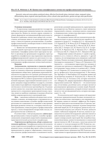 1. В переломные периоды развития государства в обществе происходят изменения ценностно-смыслового пространства. Ценности, являясь ядром сознания человека, формируют мотивационный фон деятельности. Развитие и динамика личностных ценностей, соответственно, мотивации зависят от многих факторов и связаны с этнокультурными, региональными, служебнопрофессиональными, половозрастными и личностными особенностями людей.