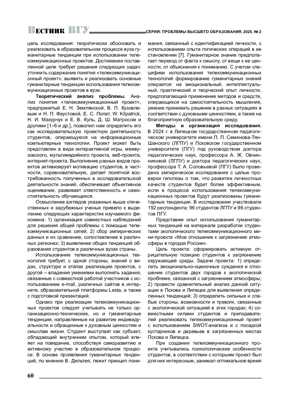 В статье раскрываются возможности использования телекоммуникационных проектов в высшей школе; описываются их особенности, способствующие развитию критического мышления, эмоционального отношения к действительности. Дается описание создания телекоммуникационного проекта в сотрудничестве университетов Пскова и Липецка; с помощью SWOT-анализа определяются основные позиции экологической ситуации в этих городах и факторы загрязнения атмосферы. Доказывается эффективность использования телекоммуникационного проекта в формировании экологического отношения у студентов.