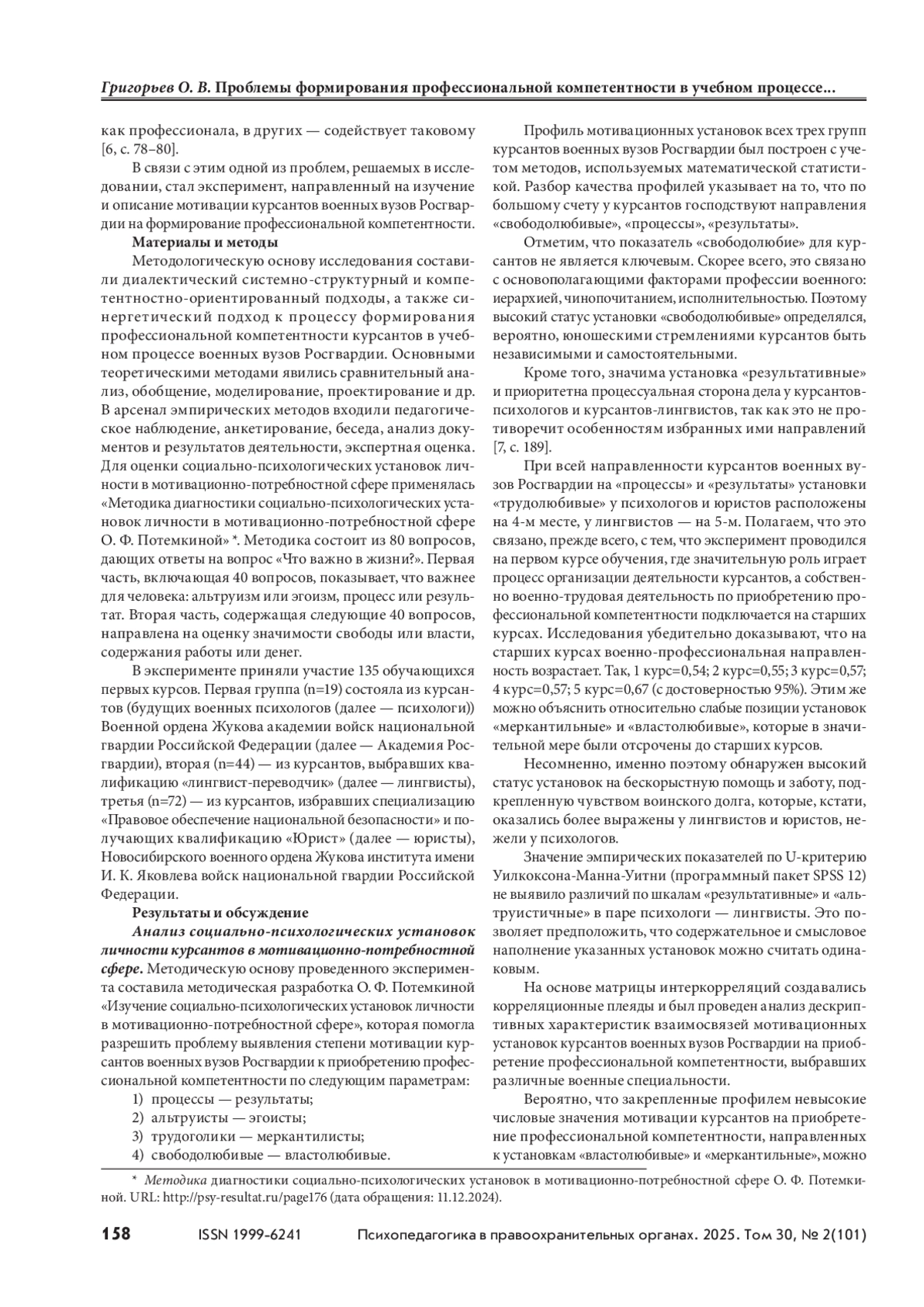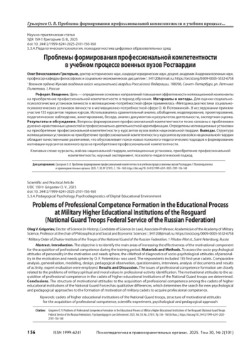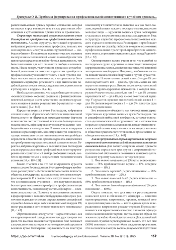 Цель — определение основных направлений повышения эффективности мотивационной компоненты на приобретение профессиональной компетентности в период обучения. Материалы и методы. Для оценки социальнопсихологических установок личности в мотивационно-потребностной сфере применялась «Методика диагностики социальнопсихологических установок личности в мотивационно-потребностной сфере О. Ф. Потемкиной». В исследовании приняли участие 135 курсантов первых курсов. Использовались сравнительный анализ, обобщение, моделирование, проектирование, педагогическое наблюдение, анкетирование, беседа, анализ документов и результатов деятельности, экспертная оценка. Результаты и обсуждение. Вопросы формирования профессиональной компетентности тесно связаны с проблемами духовно-нравственных ценностей в профессионально-деятельностной идентификации. Определены мотивационные установки на приобретение профессиональной компетентности у курсантов вузов войск национальной гвардии. Выводы. Структура мотивационных установок на приобретение профессиональной компетентности у курсантов вузов войск национальной гвардии обладает качественными различиями, что обусловливает поиск новых психолого-педагогических подходов к формированию мотивации курсантов военного вуза на приобретение профессиональной компетентности.