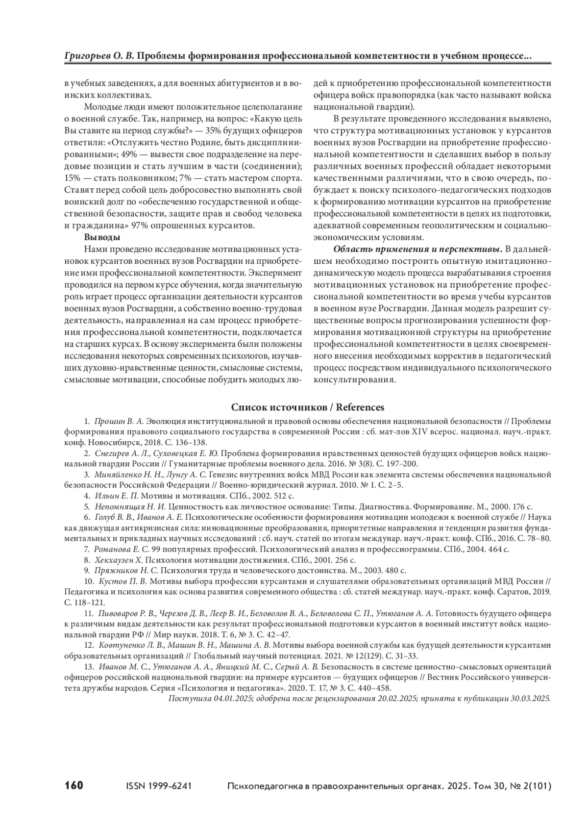 13. Иванов М. С., Утюганов А. А., Яницкий М. С., Серый А. В. Безопасность в системе ценностно-смысловых ориентаций офицеров российской национальной гвардии: на примере курсантов — будущих офицеров // Вестник Российского университета дружбы народов. Серия «Психология и педагогика». 2020. Т. 17, № 3. С. 440–458.