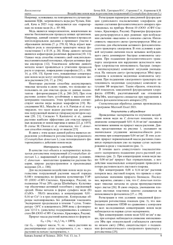 17. Thomas G., Andresen E., Mattusch J., Hubácek T., Küpper H. Deficiency and toxicity of nanomolar copper in low irradiance - a physiological and metalloproteomic study in the aquatic plant Ceratophyllum demersum // Aquatic Toxicology. 2016. Vol. 177. P. 226-236. DOI: 10.1016/j.aquatox.2016.05.016