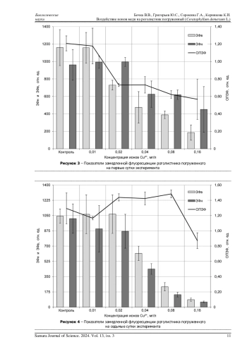 В данной статье представлены результаты исследования влияния ионов меди в концентрациях 0,01-0,16 мг/дм³ в лабораторных условиях на устойчивость высшего водного растения - роголистника погруженного. Несмотря на то, что медь является биофильным элементом, все изученные концентрации ионов данного элемента оказали негативное воздействие на прирост массы растений и величину относительного параметра замедленной флуоресценции хлорофилла (ОПЗФ) уже на первые сутки экспонирования. В течение семисуточного токсикологического эксперимента подавление роста растений при воздействии токсиканта усиливалось. Наибольшее снижение ОПЗФ по сравнению с контролем во всех исследованных концентрациях ионов меди наблюдается на первые сутки эксперимента. Однако после длительного периода нахождения роголистника в токсичной среде происходит его частичная адаптация, в результате которой некоторые части этого растения сохраняют фотосинтетическую активность. Установлено, что растения сохраняют свою жизнеспособность до концентрации 0,02 мг/дм³, соответствующей 20 ПДК в водах объектов рыбохозяйственного значения. Концентрации 0,04 мг/дм³ и выше уже на первые сутки привели к потере листьев. Устойчивость растения к действию ионов меди позволяет рассматривать его как потенциальный фиторемедиант вод, загрязненных соединениями данного элемента.