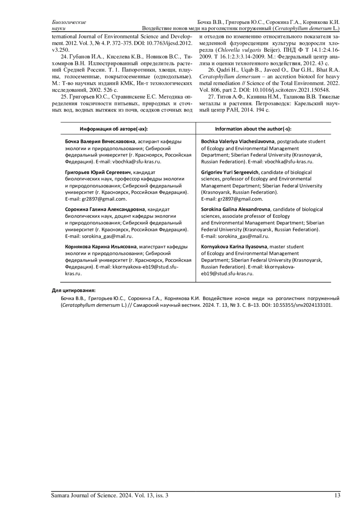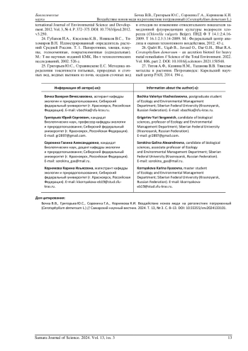 26. Qadri H., Uqab B., Javeed O., Dar G.H., Bhat R.A. Ceratophyllum demersum - an accretion biotool for heavy metal remediation // Science of the Total Environment. 2022. Vol. 806, part 2. DOI: 10.1016/j.scitotenv.2021.150548 EDN: AIHADA