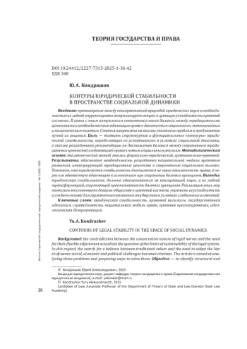 Введение: противоречие между консервативной природой юридических норм и необходимостью их гибкой корректировки актуализирует вопрос о границах устойчивости правовой системы. В связи с этим актуальным становится поиск баланса между традиционными ценностями и необходимостью адаптации права к динамичным социальным, экономическим и политическим вызовам. Статья направлена на анализ указанных проблем и предложение путей их решения. Цель - выявить структурные и функциональные «контуры» юридической стабильности, определяющие ее устойчивость в условиях социальной динамики, а также разработать рекомендации по достижению баланса между сохранением традиционных ценностей и адаптацией права к новым социальным реалиям. Методологическая основа: диалектический метод, анализ, формально-юридический, сравнительно-правовой.