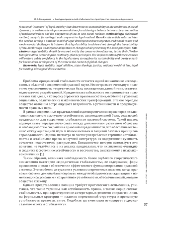 Результаты: обоснована необходимость разработки национальной модели правового развития, интегрирующей традиционные ценности и современные социальные вызовы. Показано, что юридическая стабильность достигается не через неизменность права, а через его адекватную адаптацию к изменениям при сохранении базовых принципов.