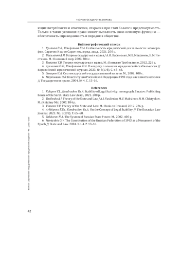 1. Кулапов В.Л., Кондрашов Ю. А. Стабильность юридической деятельности: монография. Саратов: Изд-во Сарат. гос. юрид. акад., 2021. 200 с. EDN: EZTLGY