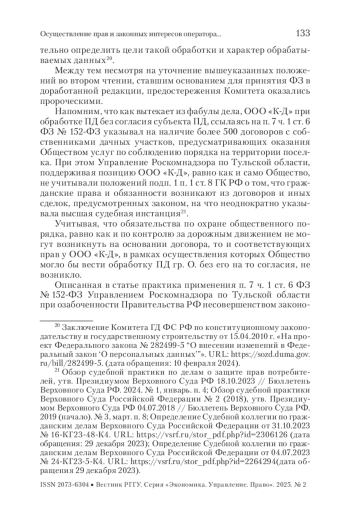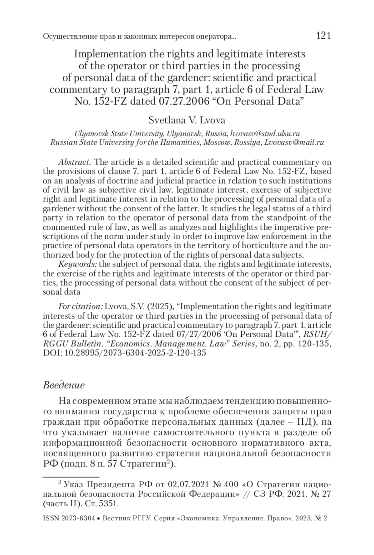 Статья представляет собой развернутый научно-практический комментарий положений п. 7 ч. 1 ст. 6 ФЗ № 152-ФЗ1, основанный на анализе доктрины и судебной практики в отношении таких институтов цивилистики, как субъективное гражданское право, законный интерес, осуществление субъективного права и законного интереса применительно к обработке персональных данных садовода без согласия последнего. Исследован правовой статус третьего лица во взаимосвязи с оператором персональных данных с позиций комментируемой нормы права, проанализированы и выделены императивные предписания исследуемой нормы с целью совершенствования правоприменения в практике деятельности операторов персональных данных на территории садоводств и управомоченного органа по защите прав субъектов персональных данных.