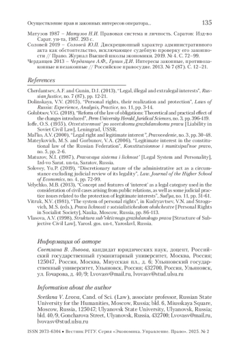 10. Соловей 2019 - Соловей Ю.П. Дискреционный характер административного акта как обстоятельство, исключающее судебную проверку его законности // Право. Журнал Высшей школы экономики. 2019. № 4. С. 72-99.