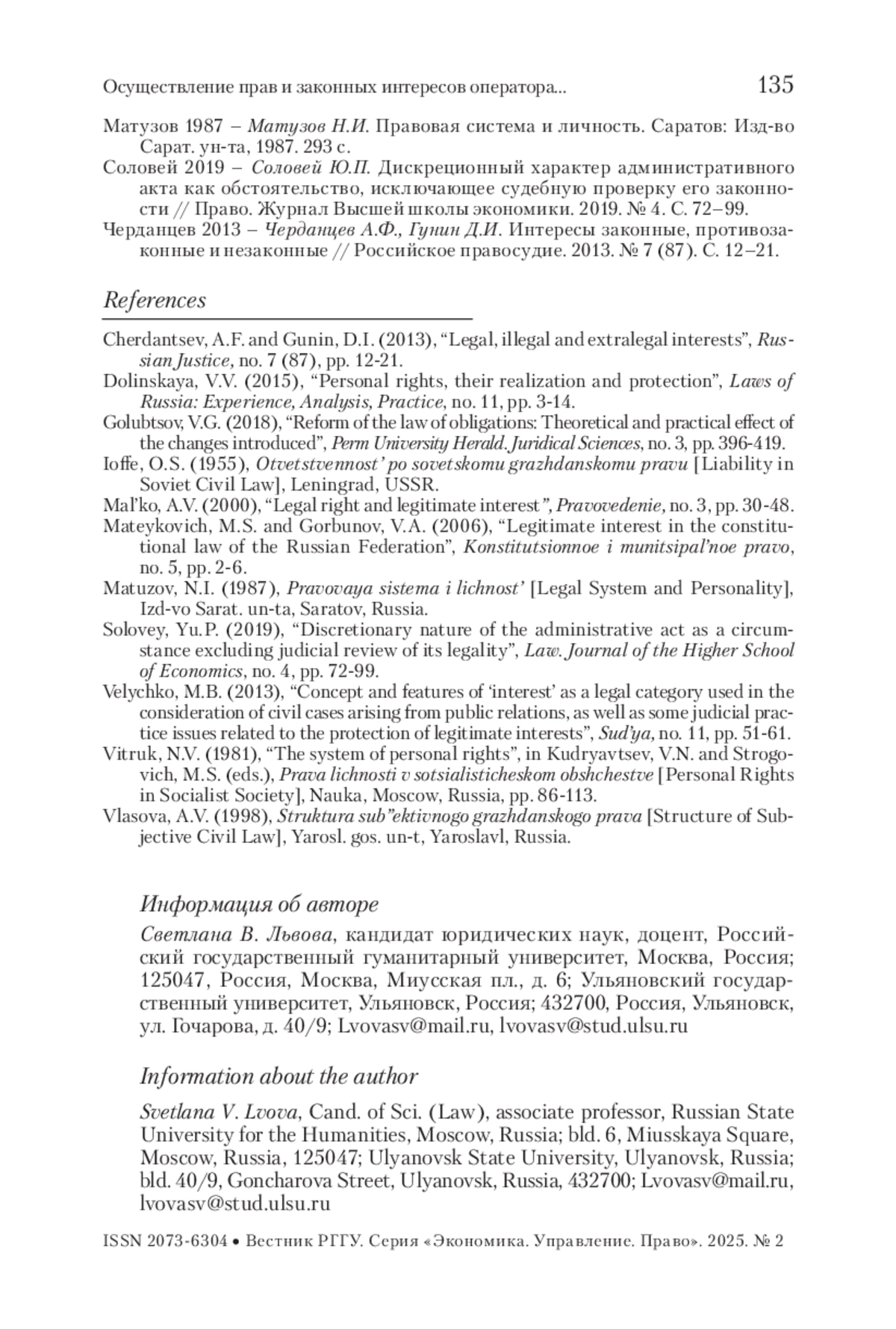 7. Малько 2000 - Малько А.В. Субъективное право и законный интерес // Правоведение. 2000. № 3. С. 30-48.