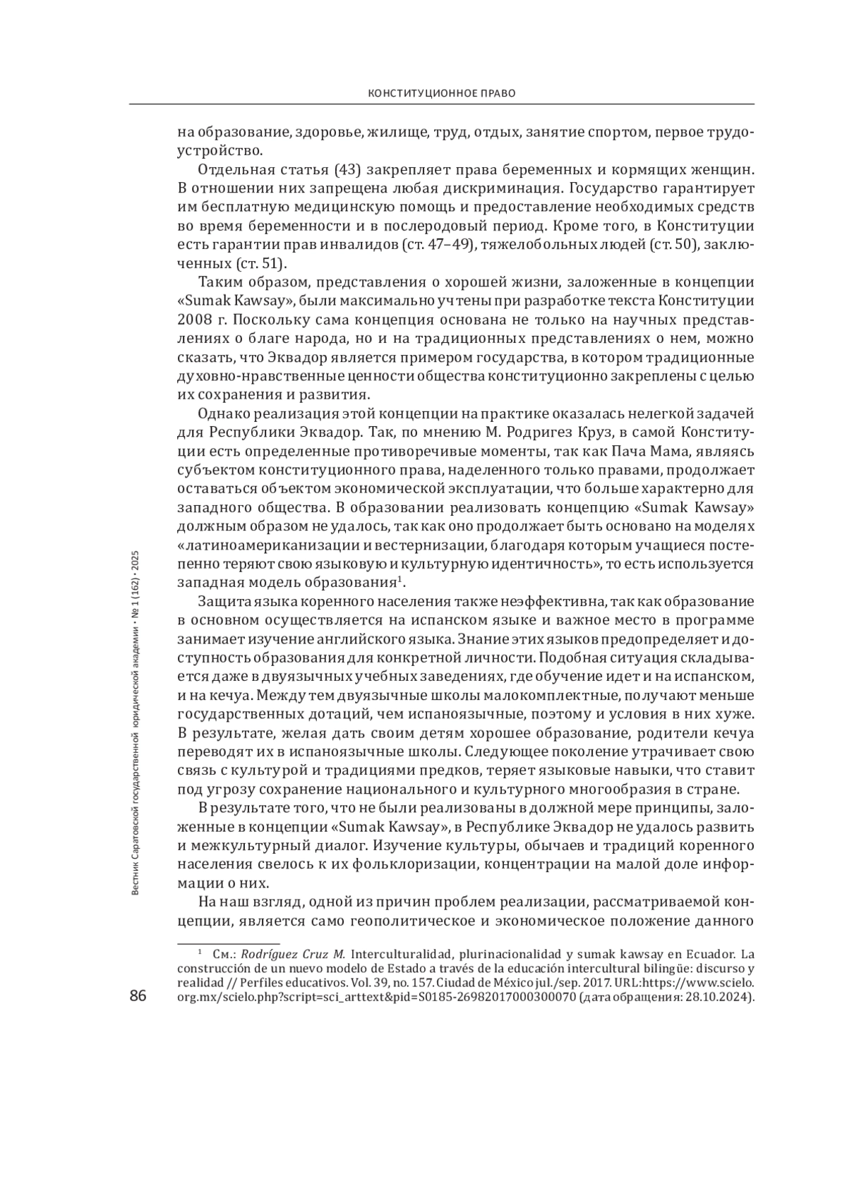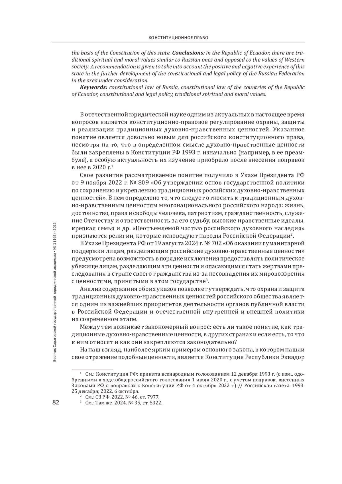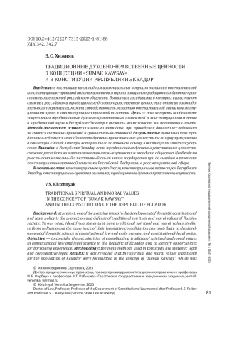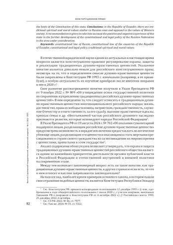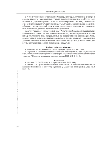 Введение: в настоящее время одним из актуальных вопросов развития отечественной конституционно-правовой политики является охрана и защита традиционных духовно-нравственных ценностей российского общества. Выявление государств, в которых существуют схожие с российскими традиционные духовно-нравственные ценности и опыт их законодательного закрепления, может способствовать развитию отечественной науки конституционного права и конституционно-правовой политики. Цель - рассмотреть особенности закрепления традиционных духовно-нравственных ценностей в конституционном праве и юридической науке в Республике Эквадор и выявить возможности заимствования опыта.