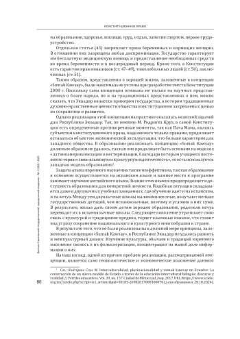 Выводы: в Республике Эквадор есть традиционные духовно-нравственные ценности, схожие с российскими и противопоставляемые ценностям западного общества. Необходимо учесть положительный и негативный опыт этого государства при дальнейшем развитии конституционно-правовой политики Российской Федерации в рассматриваемой сфере.