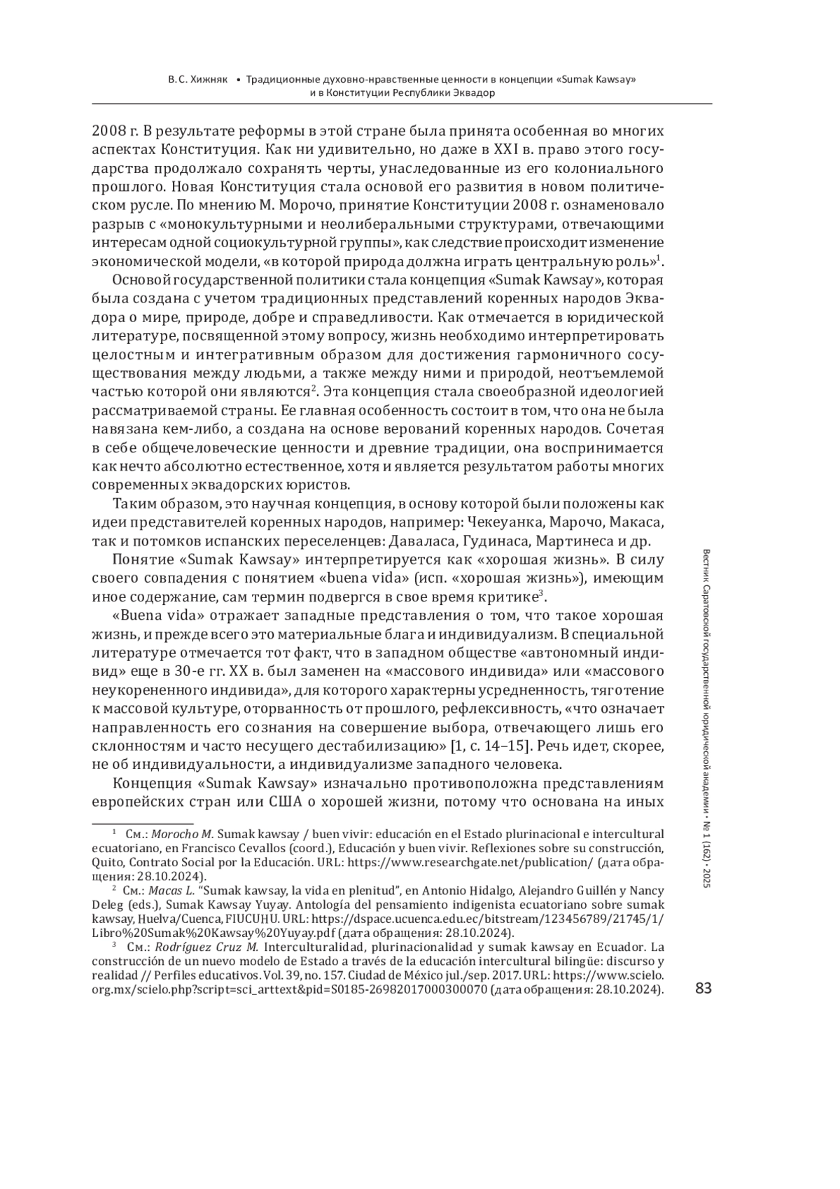 Результаты: выявлено, что традиционные для населения Эквадора духовно-нравственные ценности были сформулированы в концепции «Sumak Kawsay», которая была положена в основу Конституции этого государства.