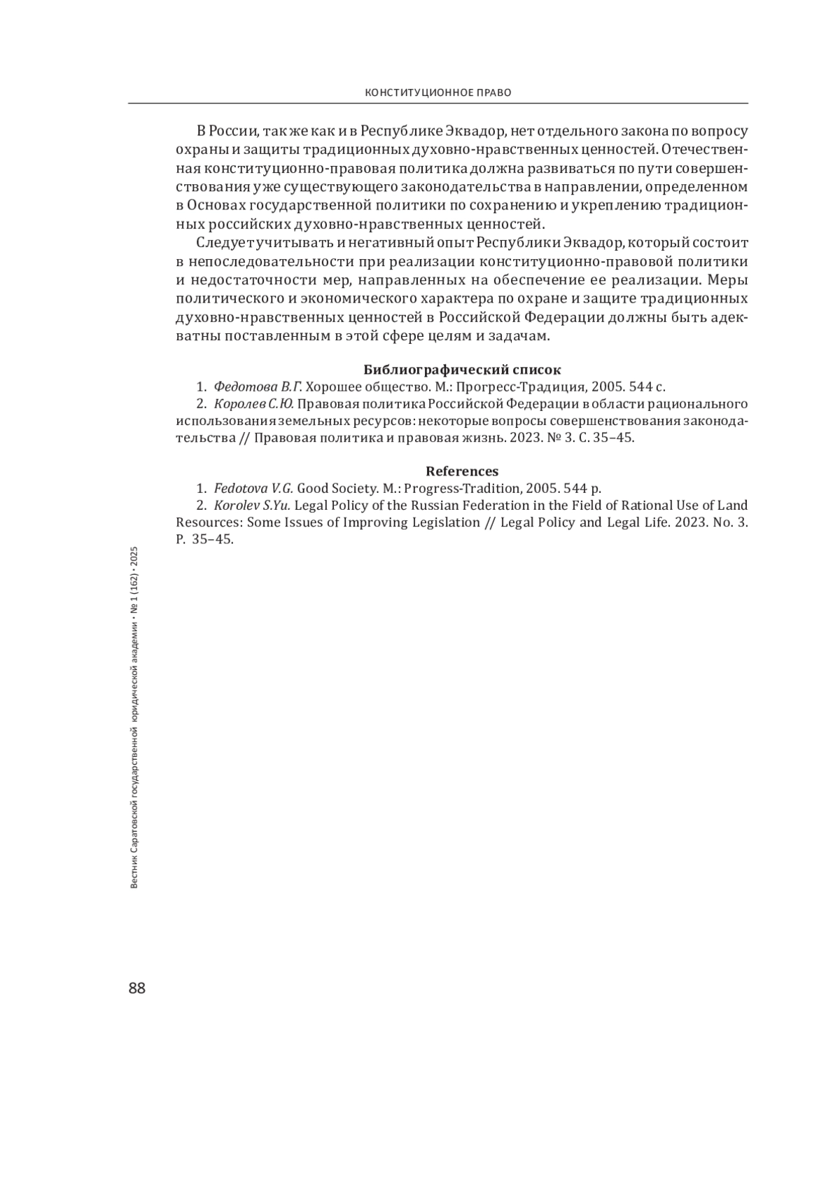 2. Королев С. Ю. Правовая политика Российской Федерации в области рационального использования земельных ресурсов: некоторые вопросы совершенствования законодательства // Правовая политика и правовая жизнь. 2023. № 3. С. 35-45. EDN: IPIUZW