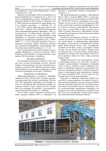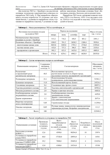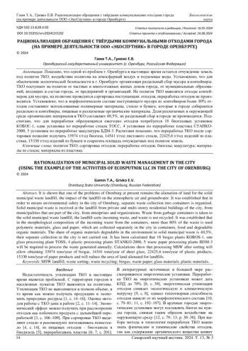 Показано, что одной из проблем г. Оренбурга в настоящее время остается отчуждение земель под полигон ТКО, воздействие полигона на атмосферный воздух и подземные воды. Установлено, что для обеспечения экологической безопасности в г. Оренбурге организован раздельный сбор мусора в контейнеры. ТКО поступают на полигон от частных и многоэтажных жилых домов города, от муниципальных образований, входящих в состав города, от предприятий и организаций. На полигон ТКО вывозятся отходы контейнеров для мусора, на полигоне проводится сортировка поступающих отходов, переработка отходов не производится. Установлено, что в морфологическом составе поступающего мусора из контейнеров более 80% отходов составляют использованные полимерные материалы, стекло и бумага, которые в городе собираются раздельно в контейнеры, пищевые и разлагаемые органические материалы. Доля разлагаемых в окружающей среде органических материалов в ТКО составляет 40,5%, их раздельный сбор в городе не производится. Подсчитано, что для переработки образующихся ежегодно отходов потребуется 18 биогазовых установок КОБОС-1, одна установка по переработке стекла ТОСС, 4 установки по переработке пластика СТАНКО-2000, 5 установок по переработке макулатуры БДМ-3. Расчетами показано, что переработка ТКО после сортировки позволит получить 33974 т/год биогаза, 14541 т/год листового стекла, 22425,6 т/год изделий из пластика, 15330 т/год изделий из бумаги и сократить площадь отчуждаемых под полигон земель.