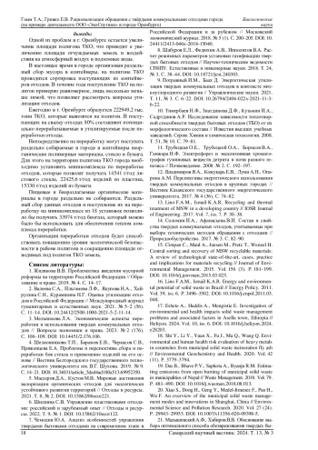 2. Валеева С.А., Ильгамова Л.Ф., Якупова Н.А., Хайрулина С.Н., Курамшина Н.Г. Оценка утилизации отходов в Российской Федерации // Международный журнал гуманитарных и естественных наук. 2021. № 5-2 (56). С. 11-14. DOI: 10.24412/2500-1000-2021-5-2-11-14 EDN: GVYBGU