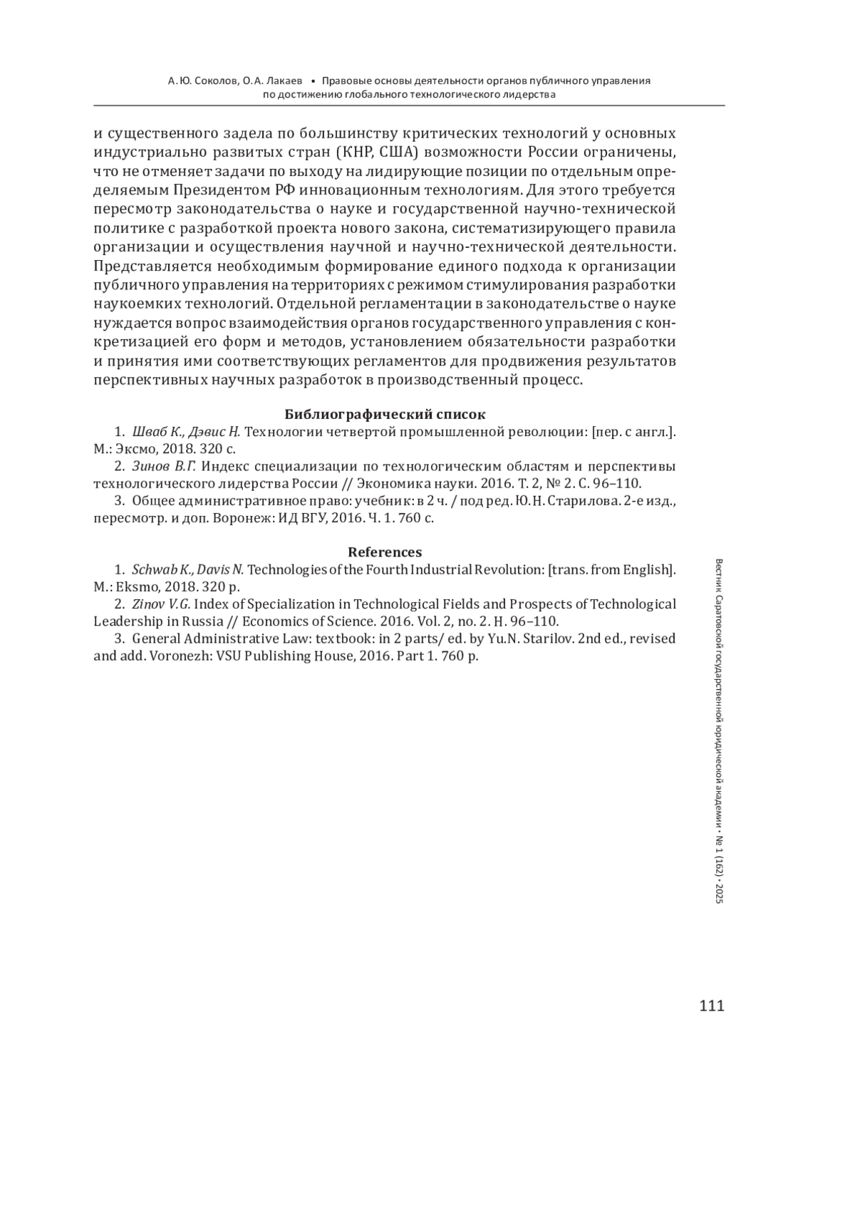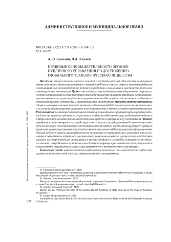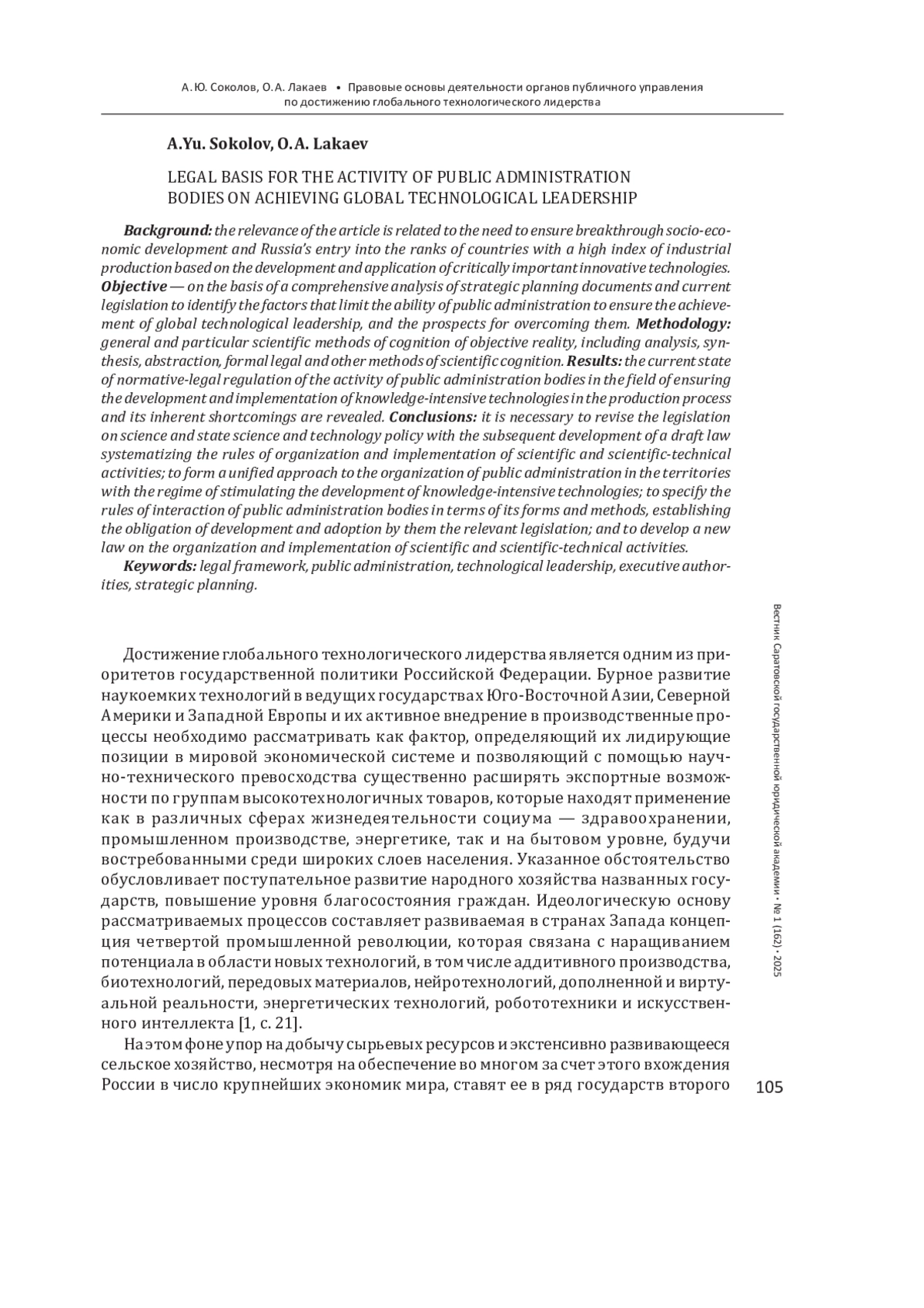 СОКОЛОВ А. Ю., ЛАКАЕВ О. А. ПРАВОВЫЕ ОСНОВЫ ДЕЯТЕЛЬНОСТИ ОРГАНОВ ПУБЛИЧНОГО УПРАВЛЕНИЯ ПО ДОСТИЖЕНИЮ ГЛОБАЛЬНОГО ТЕХНОЛОГИЧЕСКОГО ЛИДЕРСТВА // ВЕСТНИК САРАТОВСКОЙ ГОСУДАРСТВЕННОЙ ЮРИДИЧЕСКОЙ АКАДЕМИИ. 2025. № 1 (162)
