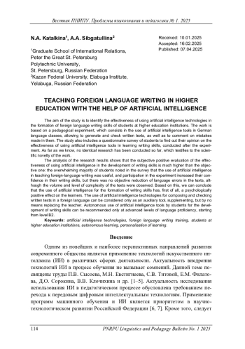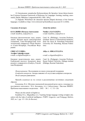 КАТАЛКИНА Н. А., СИБГАТУЛЛИНА А. А. ОБУЧЕНИЕ ИНОЯЗЫЧНОЙ ПИСЬМЕННОЙ РЕЧИ В ВУЗЕ С ПОМОЩЬЮ ИСКУССТВЕННОГО ИНТЕЛЛЕКТА // ВЕСТНИК ПЕРМСКОГО НАЦИОНАЛЬНОГО ИССЛЕДОВАТЕЛЬСКОГО ПОЛИТЕХНИЧЕСКОГО УНИВЕРСИТЕТА. ПРОБЛЕМЫ ЯЗЫКОЗНАНИЯ И ПЕДАГОГИКИ. 2025. № 1