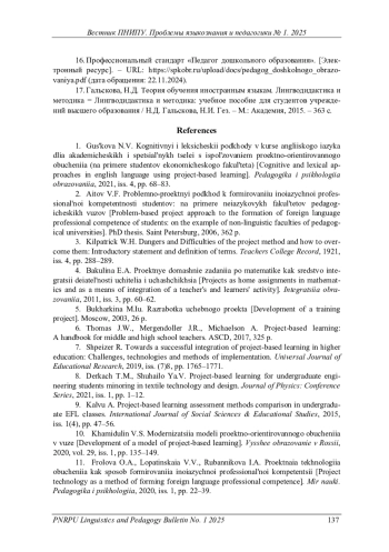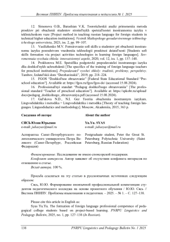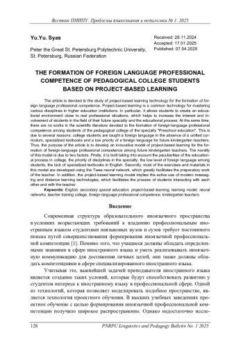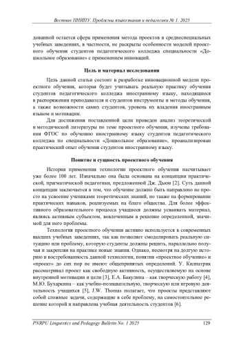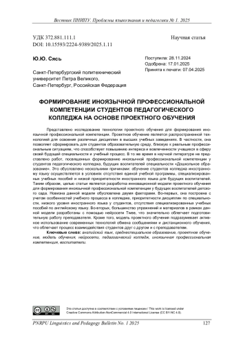СЯСЬ Ю. Ю. ФОРМИРОВАНИЕ ИНОЯЗЫЧНОЙ ПРОФЕССИОНАЛЬНОЙ КОМПЕТЕНЦИИ СТУДЕНТОВ ПЕДАГОГИЧЕСКОГО КОЛЛЕДЖА НА ОСНОВЕ ПРОЕКТНОГО ОБУЧЕНИЯ // ВЕСТНИК ПЕРМСКОГО НАЦИОНАЛЬНОГО ИССЛЕДОВАТЕЛЬСКОГО ПОЛИТЕХНИЧЕСКОГО УНИВЕРСИТЕТА. ПРОБЛЕМЫ ЯЗЫКОЗНАНИЯ И ПЕДАГОГИКИ. 2025. № 1