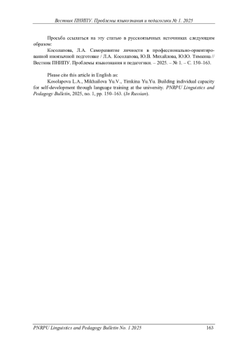 Рассматриваются изменения в профессиональной подготовке студентов и их готовности к изменяющимся условиям профессиональной деятельности, происходящим благодаря развитию современных технологий, роботизации и автоматизации многих производственных процессов. Основной акцент делается на необходимости интеграции фундаментальных знаний и способности личности к саморазвитию. Это качество становится ключевым для успешной профессиональной карьеры. Способность к саморазвитию – надпрофессиональное универсальное качество, позволяющее специалисту адаптироваться к новым условиям, повышать свою личную эффективность и готовиться к карьерным изменениям. В этом контексте формирование способности к саморазвитию является неотъемлемой частью образования в вузе, что подкрепляется обращением к методологии профессиональной подготовки, направленной на развитие личности будущих специалистов. В работе показана роль профессионально ориентированного обучения иностранному языку в формировании способности к саморазвитию, выделена взаимосвязь между процессами овладения языком и способностями к самоорганизации, самооценке и саморефлексии. Иноязычная подготовка, обладающая характеристиками вариативности, позволяет студентам изучать образовательные варианты, учитывающие их будущие профессиональные потребности. В рамках образовательного варианта возможно научить студентов тайм-менеджменту, работе с информационными ресурсами и с текстовыми материалами. Таким образом, мы можем стимулировать процессы саморазвития, которые носят осознанный характер. Взаимодействие студентов, в том числе на иностранном языке, – ключ к развитию необходимых качеств будущего специалиста. Межличностное взаимодействие в группах, организуемое на занятиях по иностранному языку, помогает студентам обсуждать пути саморазвития, представлять свой собственный опыт и оценивать себя.