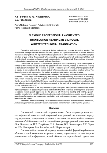 Дано описание технологии гибкого профессионально ориентированного переводческого чтения. В качестве исходных понятий принимаются «смысловое решение», «речевой поступок», «речедеятельностная единица письменного технического перевода» и др. Важной методологической основной выступает теория В. Д. Шадрикова о сложной структуре целеполагания. Обоснована необходимость включения во все упражнения и коммуникативно-речевые задачи целого, связного, осмысленного текста и его единиц. Сформулированы условия овладения знаниями, операциями и речевыми навыками. Для раскрытия специфики переводческого осмысления и понимания авторами раскрывается содержание ряда принципиальных вопросов о видах смысловых связей, роли информативного чтения как общения-диалога, последовательности осуществления речевых операций, речевых действий и речевой деятельности чтения во взаимосвязи с речевой деятельностью репродуктивного и продуктивного, творческого письма. В качестве ведущего типа структуры программы смыслового содержания при этом предлагается денотатная структура. Подробно изложена последовательность шагов, составляющих технологию обучения профессиональному переводческому чтению, которые предполагают выявление, осмысление, понимание всех мыслей каждого фрагмента, в своей совокупности образующих программу его смыслового содержания. В ходе исследования получила подтверждение гипотеза о том, что представленный способ выявления и фиксации лексем, объединенных по смыслу в денотатах, является наиболее эффективным способом на начальном этапе по сравнению со способом выявления, осмысления и формирования тема-рематических единств. Эффективность предложенной технологии обучения выявлению и пониманию всех смысловых связей в речевых фрагментах обусловлена строгой последовательностью и интеграцией разнохарактерных операций: речевых лексических операций в процессе действий информативного чтения и письма-фиксации, речемыслительных операций выявления сочетаемостно-синтагматических отношений между словами, речемыслительных операций думания и выделения слов в группу «тема» и «рема», лексико-морфологических операций и др.
