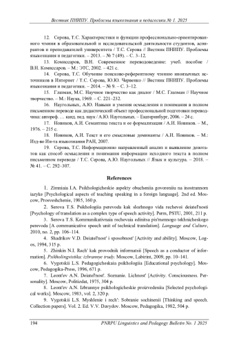 12. Серова, Т.С. Характеристики и функции профессионально-ориентированного чтения в образовательной и исследовательской деятельности студентов, аспирантов и преподавателей университета / Т.С. Серова // Вестник ПНИПУ. Проблемы языкознания и педагогики. - 2013. - № 7 (49). - С. 3-12.