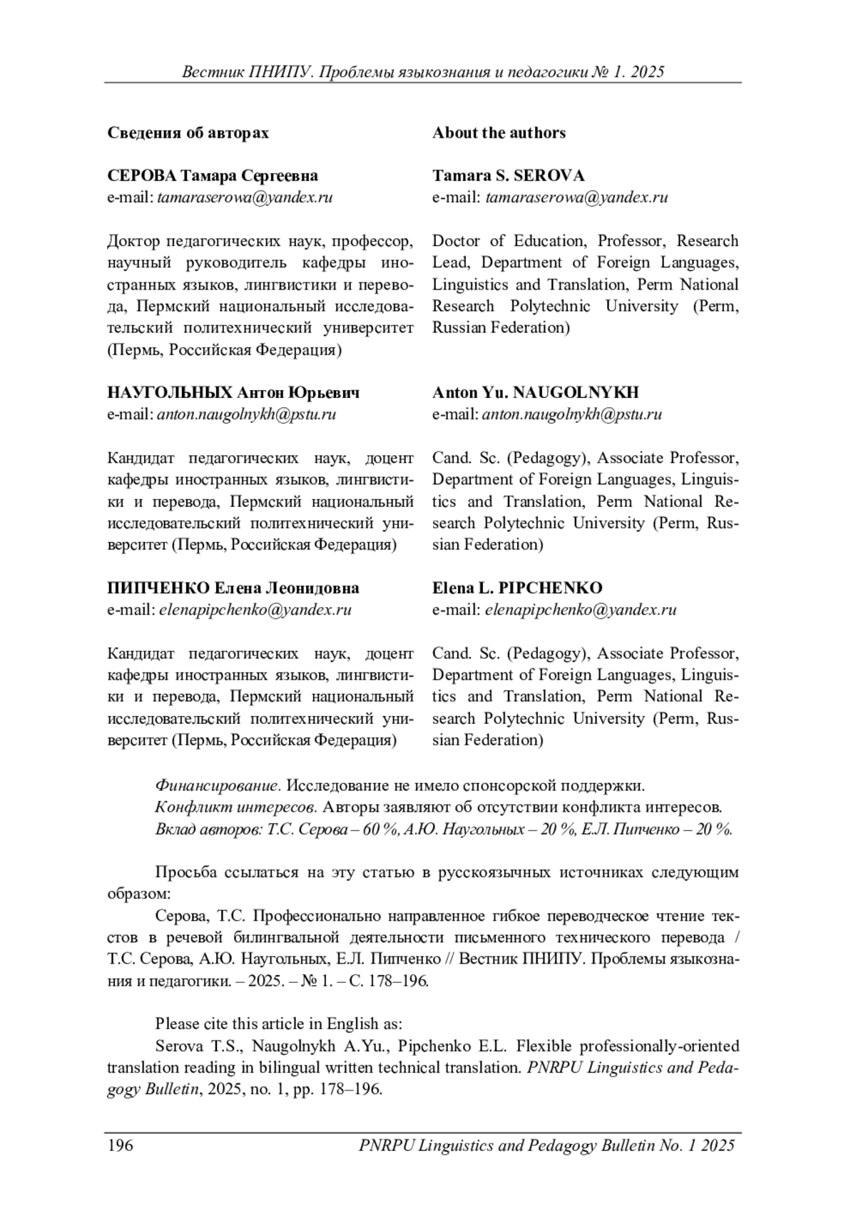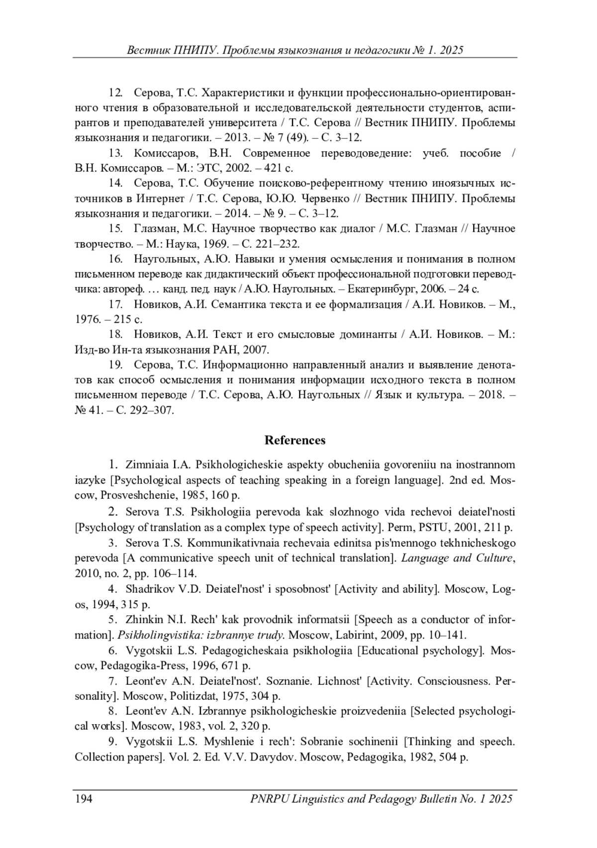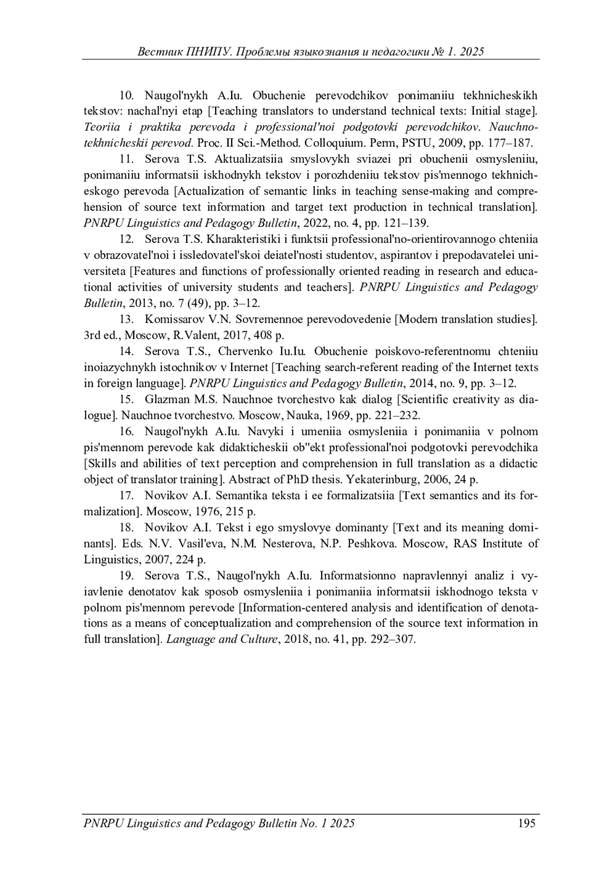 11. Серова, Т.С. Актуализация смысловых связей при обучении осмыслению, пониманию информации исходных текстов и порождению текстов письменного технического перевода / Т.С. Серова // Вестник ПНИПУ. Проблемы языкознания и педагогики. - 2022. - № 4. - С. 121-139.