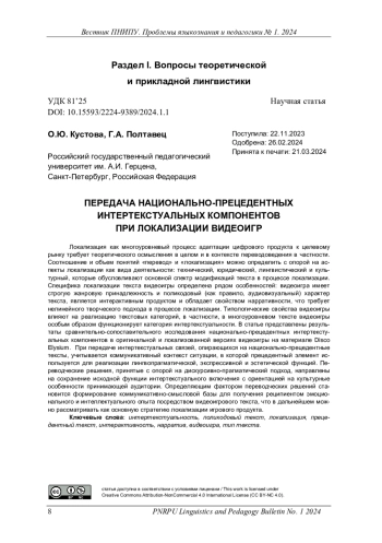 КУСТОВА О. Ю., ПОЛТАВЕЦ Г. А. ПЕРЕДАЧА НАЦИОНАЛЬНО-ПРЕЦЕДЕНТНЫХ ИНТЕРТЕКСТУАЛЬНЫХ КОМПОНЕНТОВ ПРИ ЛОКАЛИЗАЦИИ ВИДЕОИГР // ВЕСТНИК ПЕРМСКОГО НАЦИОНАЛЬНОГО ИССЛЕДОВАТЕЛЬСКОГО ПОЛИТЕХНИЧЕСКОГО УНИВЕРСИТЕТА. ПРОБЛЕМЫ ЯЗЫКОЗНАНИЯ И ПЕДАГОГИКИ. 2024. № 1