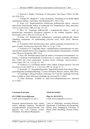 Ключевые фразы: интертекстуальность, ПОЛИКОДОВЫЙ ТЕКСТ, локализация, прецедентный текст, интерактивность, НАРРАТИВ, видеоигра, тип текста