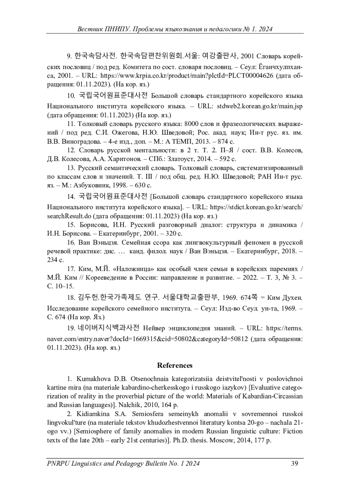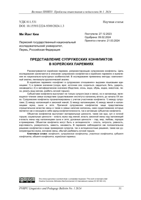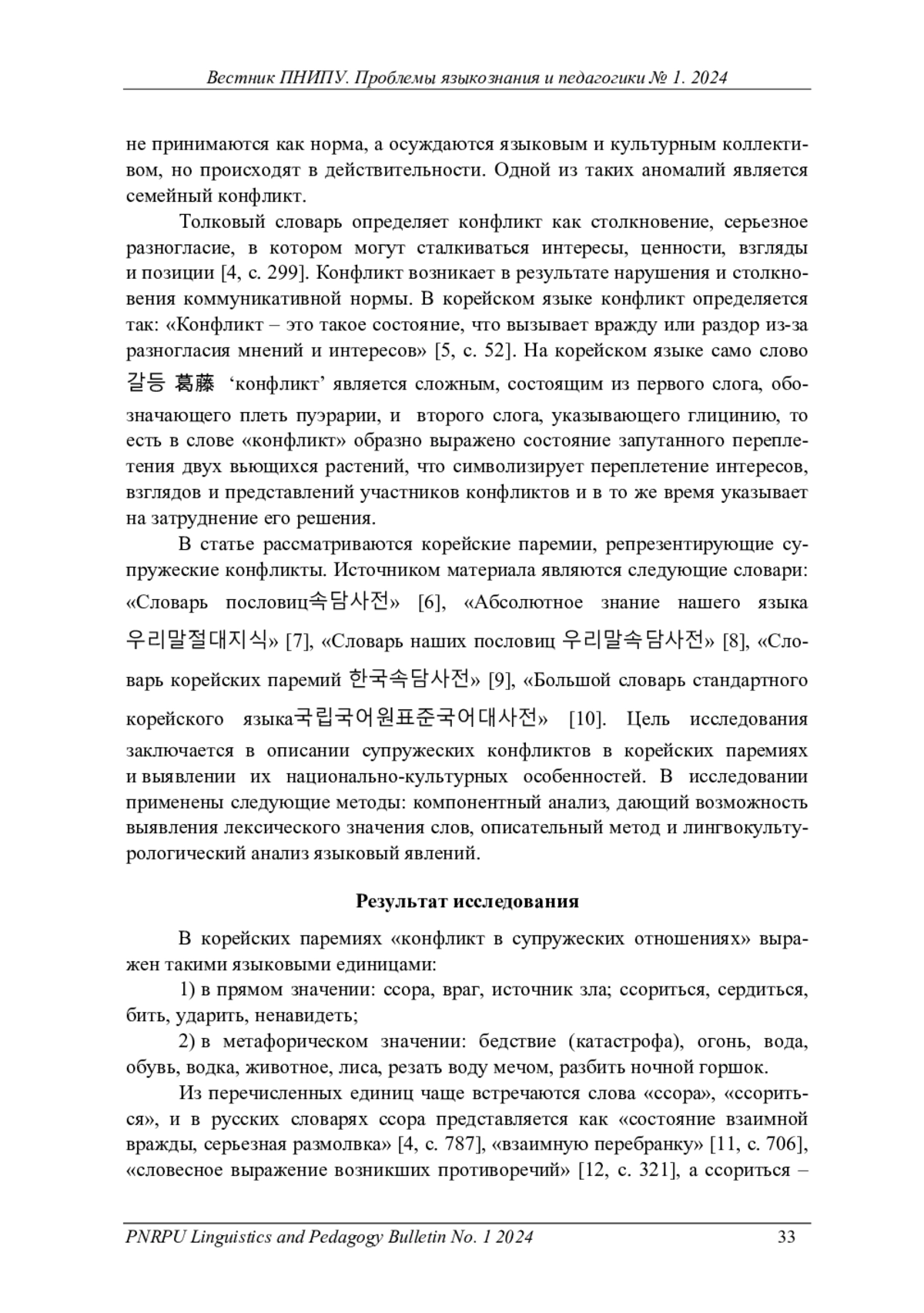 КИМ М. Й. ПРЕДСТАВЛЕНИЕ СУПРУЖЕСКИХ КОНФЛИКТОВ В КОРЕЙСКИХ ПАРЕМИЯХ // ВЕСТНИК ПЕРМСКОГО НАЦИОНАЛЬНОГО ИССЛЕДОВАТЕЛЬСКОГО ПОЛИТЕХНИЧЕСКОГО УНИВЕРСИТЕТА. ПРОБЛЕМЫ ЯЗЫКОЗНАНИЯ И ПЕДАГОГИКИ. 2024. № 1