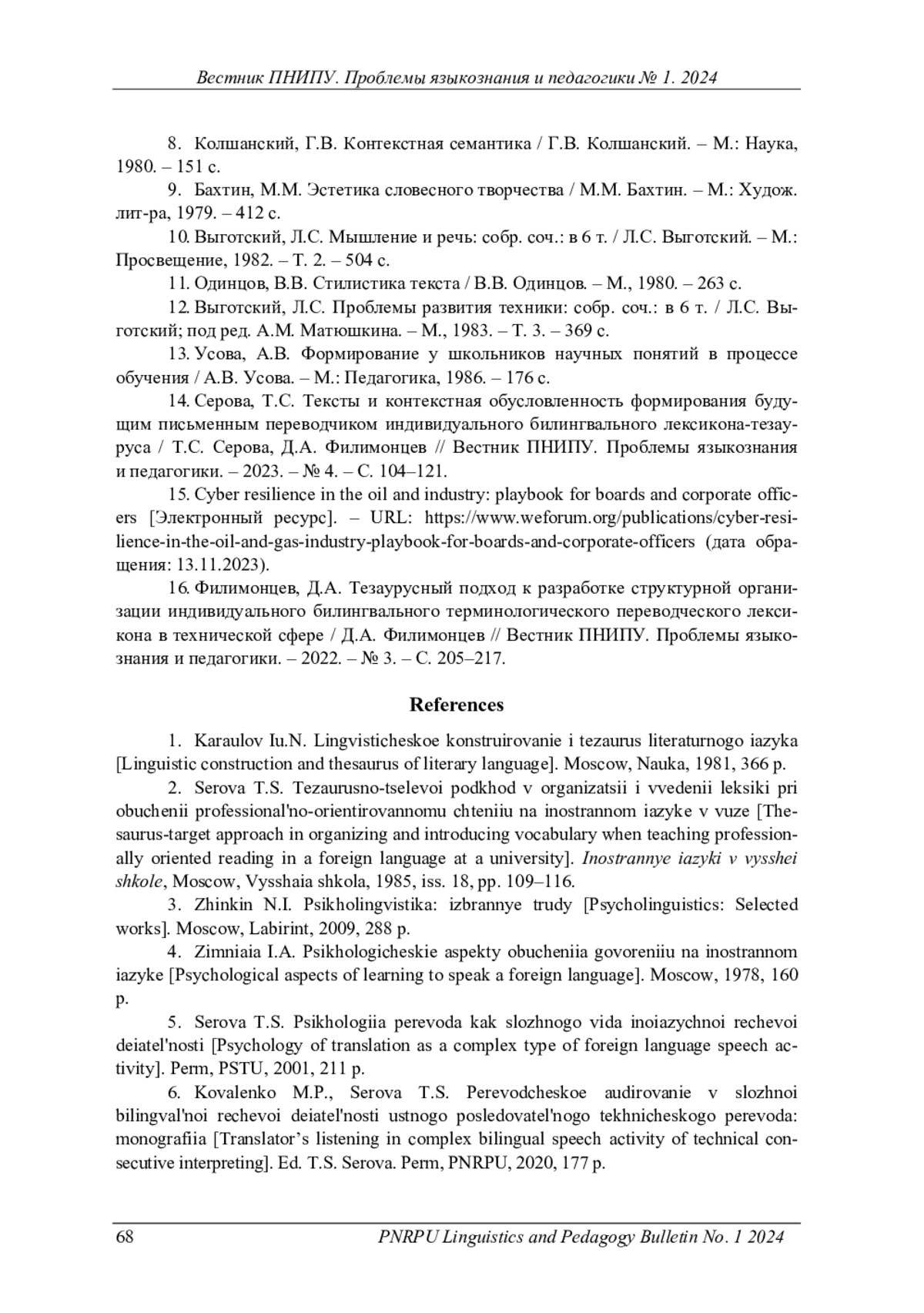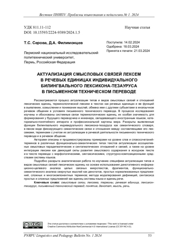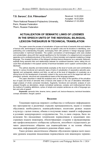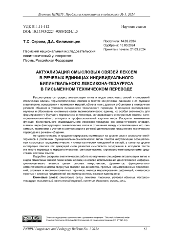 СЕРОВА Т. С., ФИЛИМОНЦЕВ Д. А. АКТУАЛИЗАЦИЯ СМЫСЛОВЫХ СВЯЗЕЙ ЛЕКСЕМ В РЕЧЕВЫХ ЕДИНИЦАХ ИНДИВИДУАЛЬНОГО БИЛИНГВАЛЬНОГО ЛЕКСИКОНА-ТЕЗАУРУСА В ПИСЬМЕННОМ ТЕХНИЧЕСКОМ ПЕРЕВОДЕ // ВЕСТНИК ПЕРМСКОГО НАЦИОНАЛЬНОГО ИССЛЕДОВАТЕЛЬСКОГО ПОЛИТЕХНИЧЕСКОГО УНИВЕРСИТЕТА. ПРОБЛЕМЫ ЯЗЫКОЗНАНИЯ И ПЕДАГОГИКИ. 2024. № 1