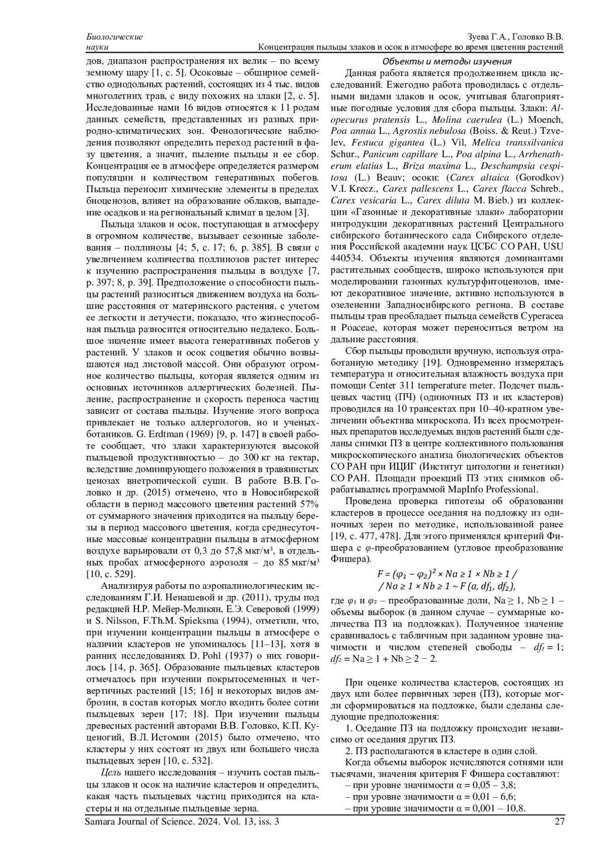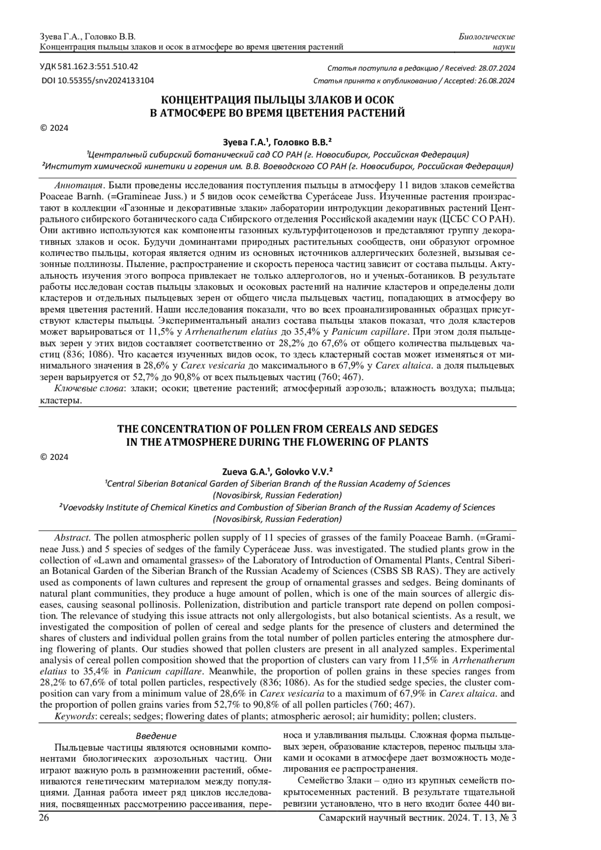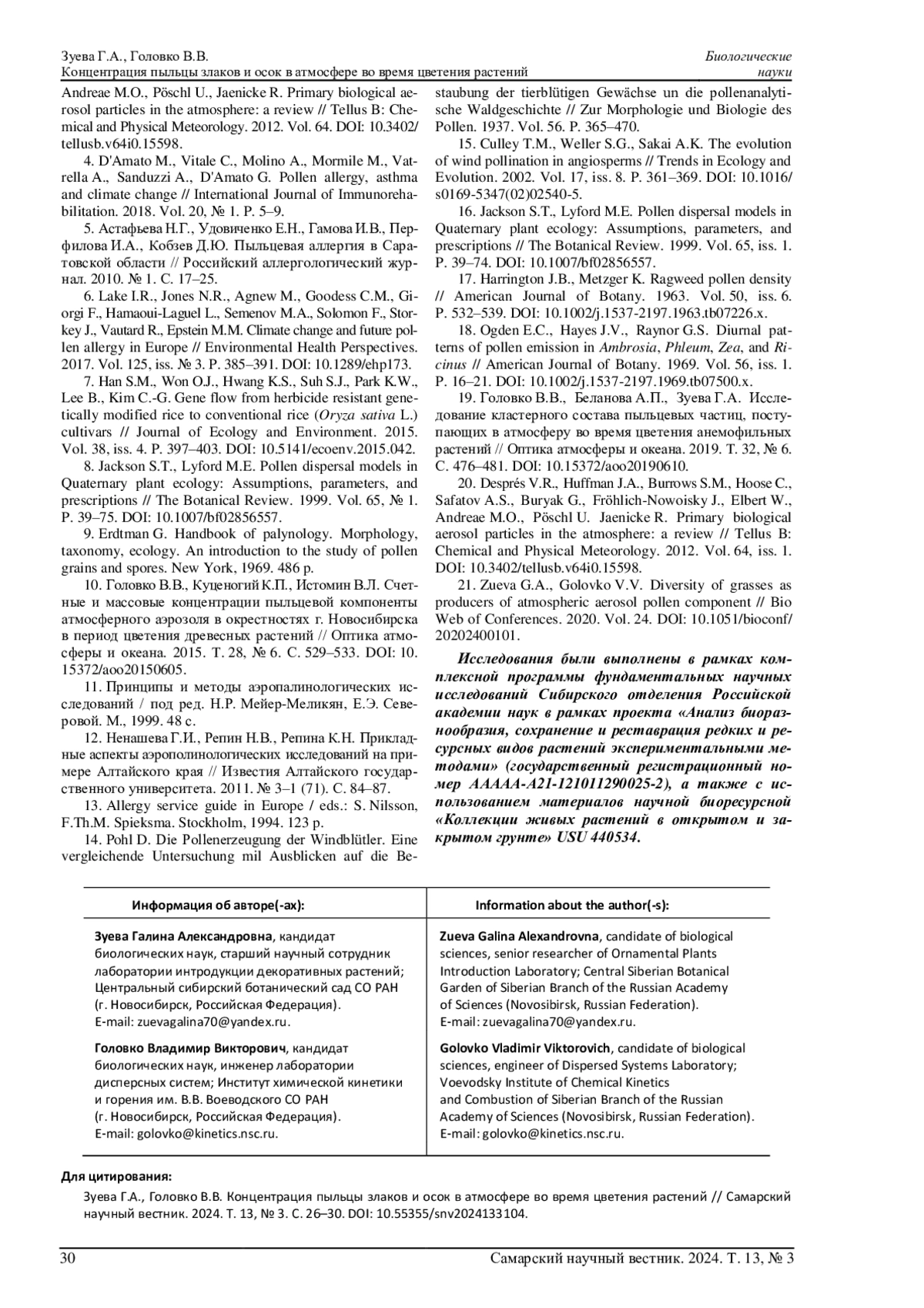 ЗУЕВА Г. А., ГОЛОВКО В. В. КОНЦЕНТРАЦИЯ ПЫЛЬЦЫ ЗЛАКОВ И ОСОК В АТМОСФЕРЕ ВО ВРЕМЯ ЦВЕТЕНИЯ РАСТЕНИЙ // САМАРСКИЙ НАУЧНЫЙ ВЕСТНИК. 2024. ТОМ 13, № 3