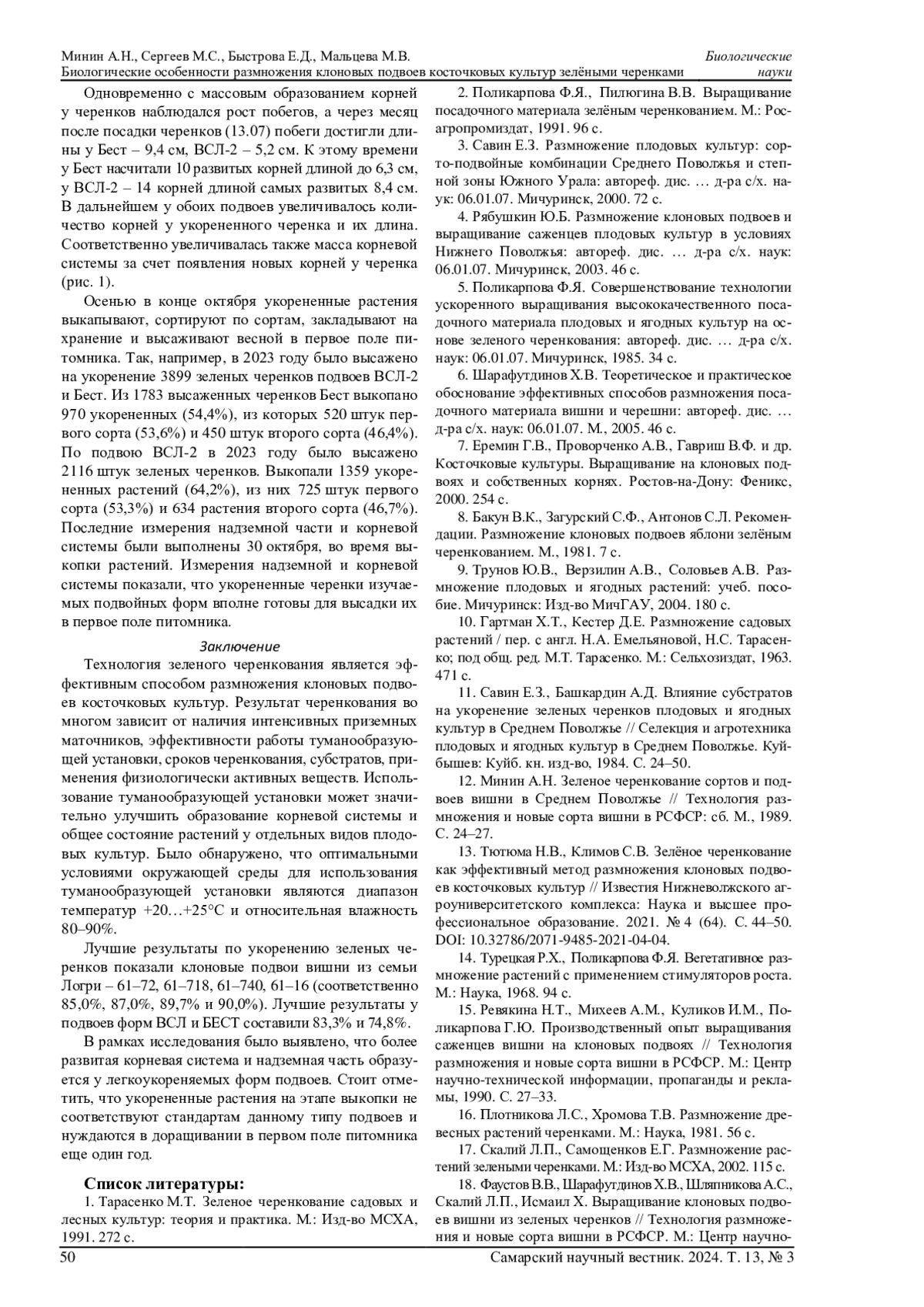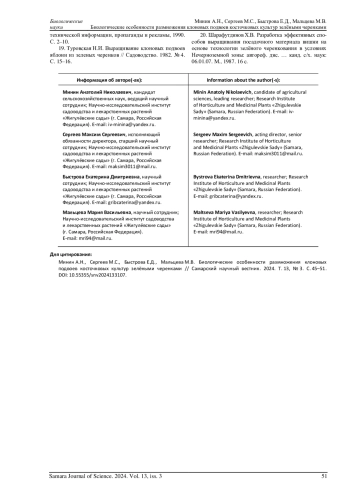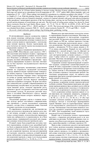 12. Минин А.Н. Зеленое черенкование сортов и подвоев вишни в Среднем Поволжье // Технология размножения и новые сорта вишни в РСФСР: сб. М., 1989. С. 24-27.