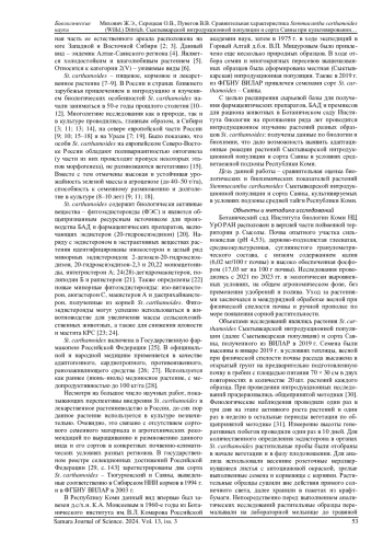 Проведена сравнительная оценка биологических и биохимических показателей растений Stemmacantha carthamoides местной репродукции и сорта Саяны, культивируемых в условиях подзоны средней тайги Республики Коми. Показано, что в условиях культуры особи обоих образцов характеризуются высокими показателями жизненности особей, семенной продуктивности, накапливают в надземных и подземных органах достаточное количество экдистерона (не менее 0,1%). Отмечено, что почвенно-климатические условия района интродукции благоприятны для выращивания обоих изучаемых образцов St. carthamoides, и Сыктывкарская популяция может служить основой для создания нового сорта. По содержанию экдистерона в корневищах с корнями и весенних розеточных листьях Сыктывкарская интродукционная популяция не уступает сорту Саяны и превосходит последний по количеству данного вещества в семенах. В неразвернувшихся листьях массовая доля экдистерона составила не менее 0,12 ± 0,01%. Установлено, что максимальное количество экдистероидов находится в зрелых семенах St. carthamoides и их содержание зависит от образца и погодных условий вегетационного сезона (Сыктывкарская популяция - 3,04-4,28%, сорт Саяны - 2,84-2,87%). Обращено внимание на возможность извлечения экдистерона технологически более выгодным путем, используя зрелые семена St. carthamoides. Отмечена проблема ежегодного получения доброкачественных семян данного вида - защита урожая семян от склевывания вьюрками.
