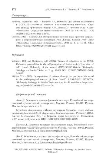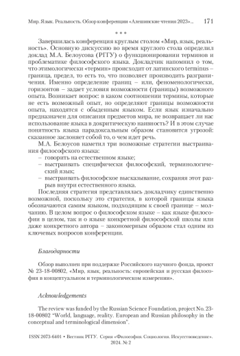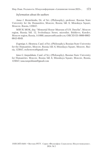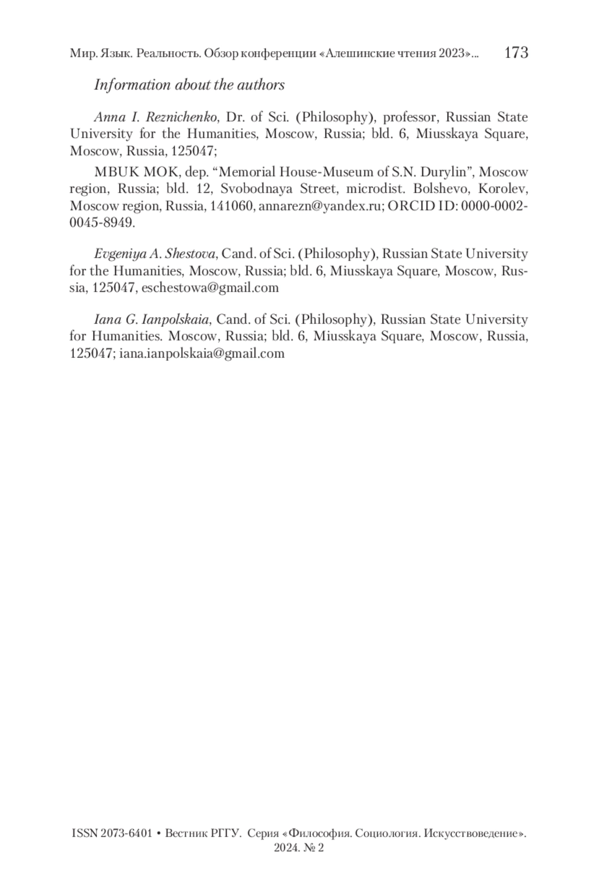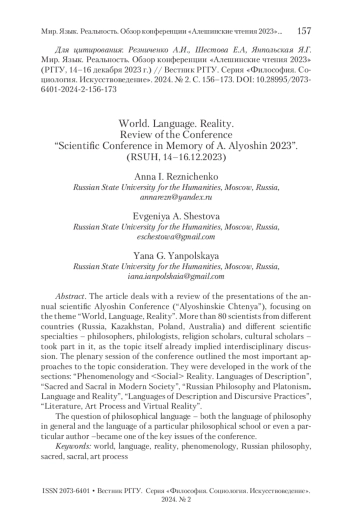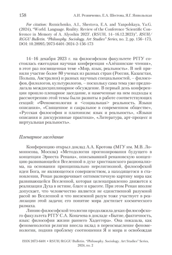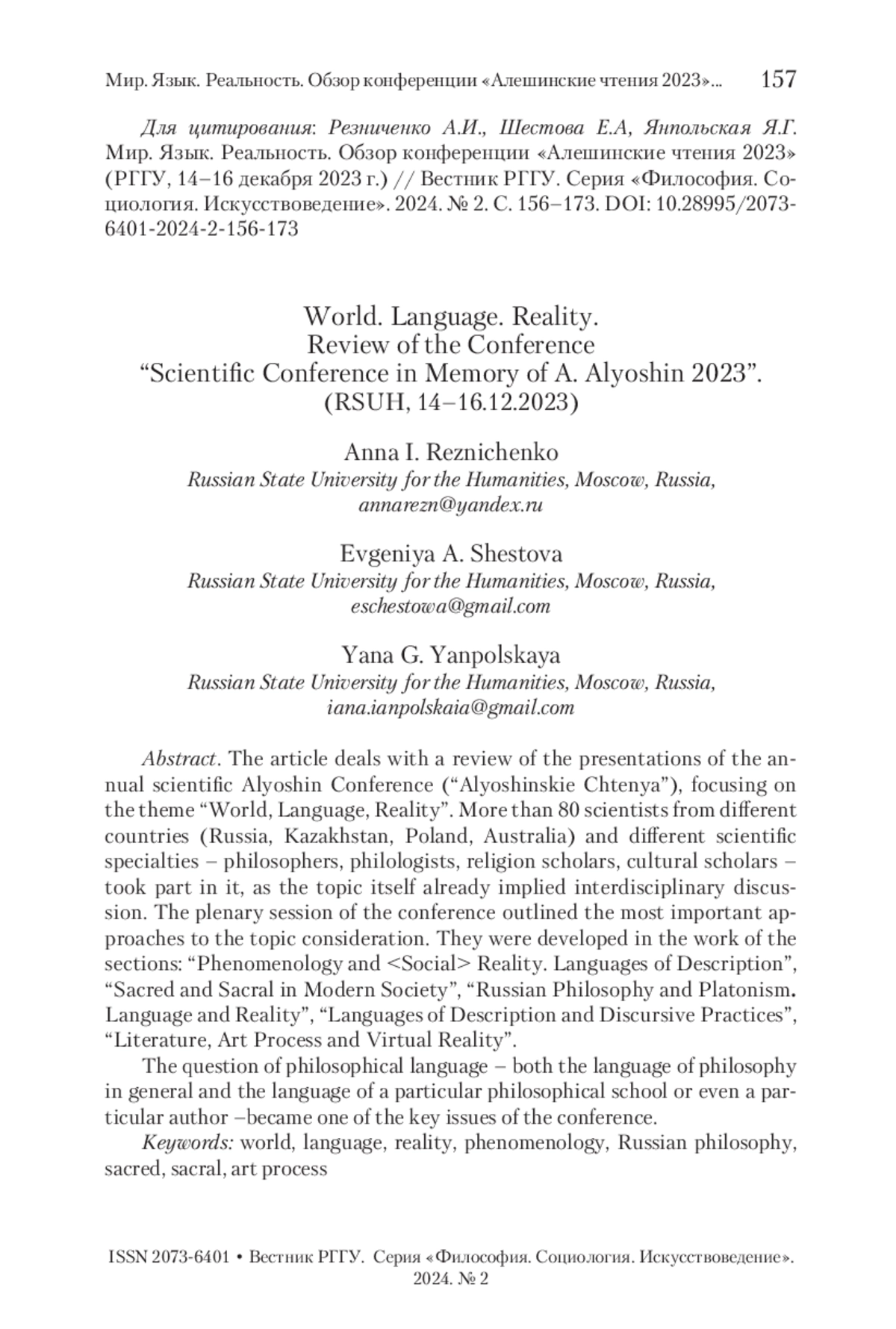 РЕЗНИЧЕНКО А. И., ШЕСТОВА Е. А., ЯНПОЛЬСКАЯ Я. Г. МИР. ЯЗЫК. РЕАЛЬНОСТЬ. ОБЗОР КОНФЕРЕНЦИИ «АЛЕШИНСКИЕ ЧТЕНИЯ 2023» (РГГУ, 14–16 ДЕКАБРЯ 2023 Г.) // ВЕСТНИК РГГУ. СЕРИЯ: ФИЛОСОФИЯ. СОЦИОЛОГИЯ. ИСКУССТВОВЕДЕНИЕ. 2024. № 2